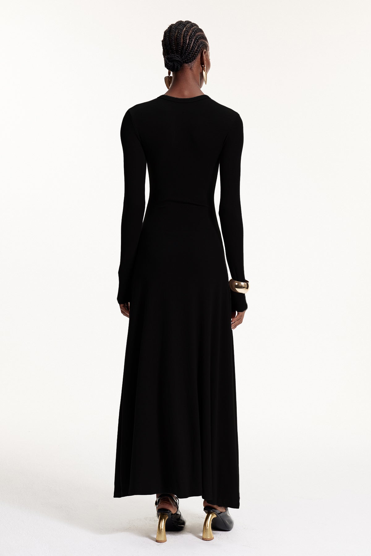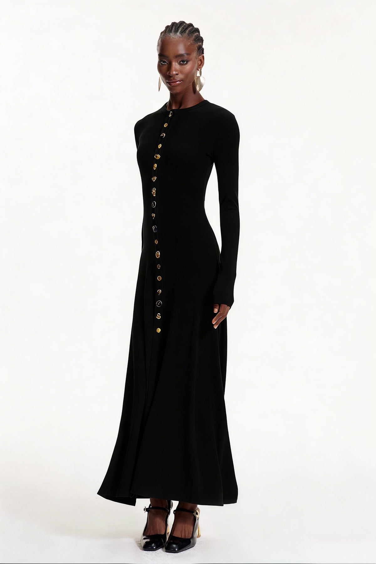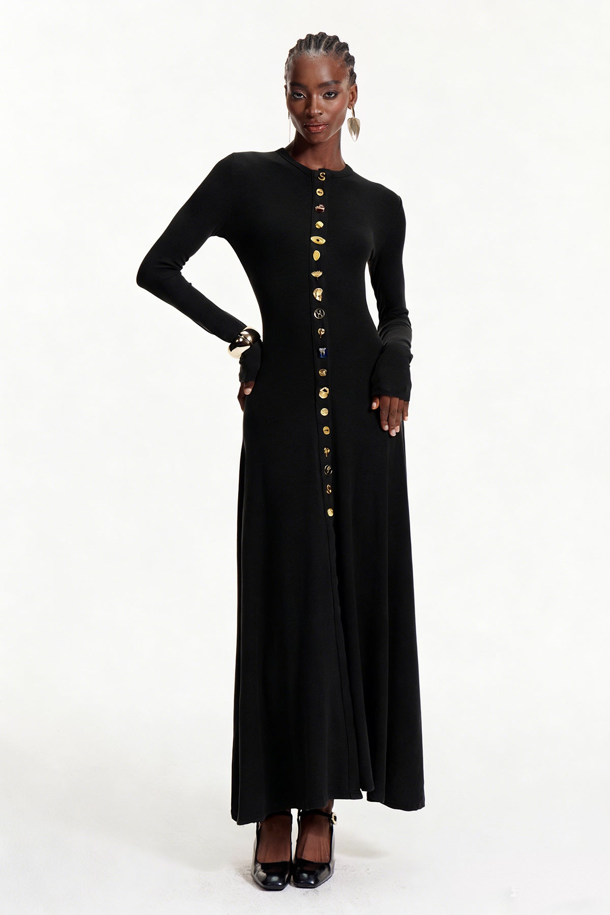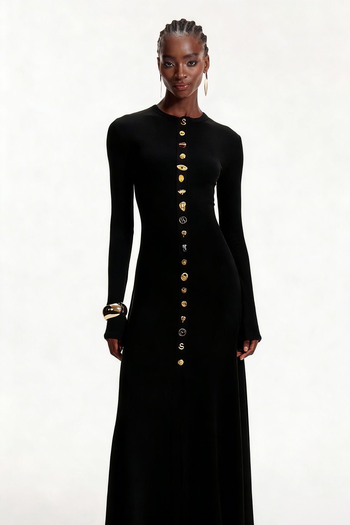 Elevate your evening wardrobe with the Elodie Button Ruffle Maxi Dress in Black. This sophisticated piece features delicate ruffle detailing and a refined button-front closure that adds dimension and visual interest. The flowing maxi silhouette offers graceful movement and timeless elegance, making it an ideal choice for formal occasions, upscale dinners, or special events. Crafted with attention to detail, this dress combines classic design elements with contemporary styling for a versatile addition to any collection.