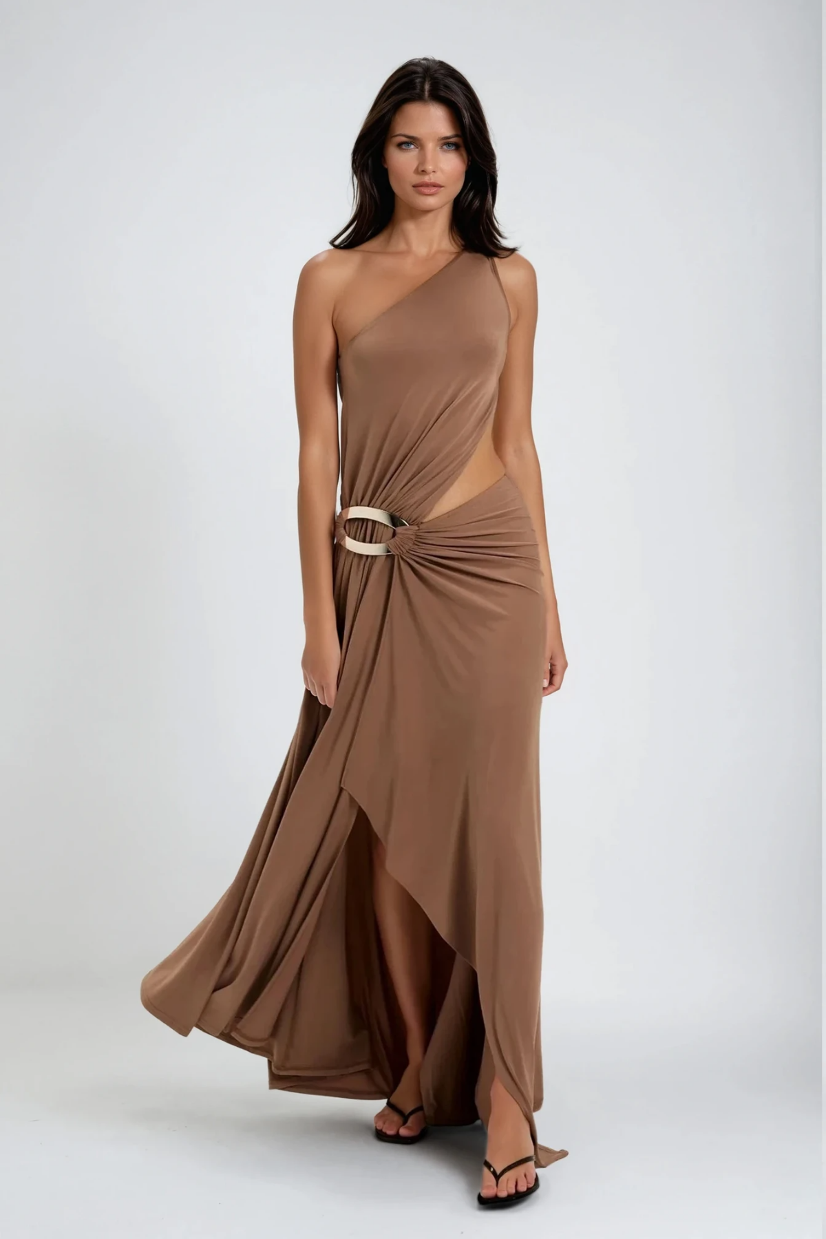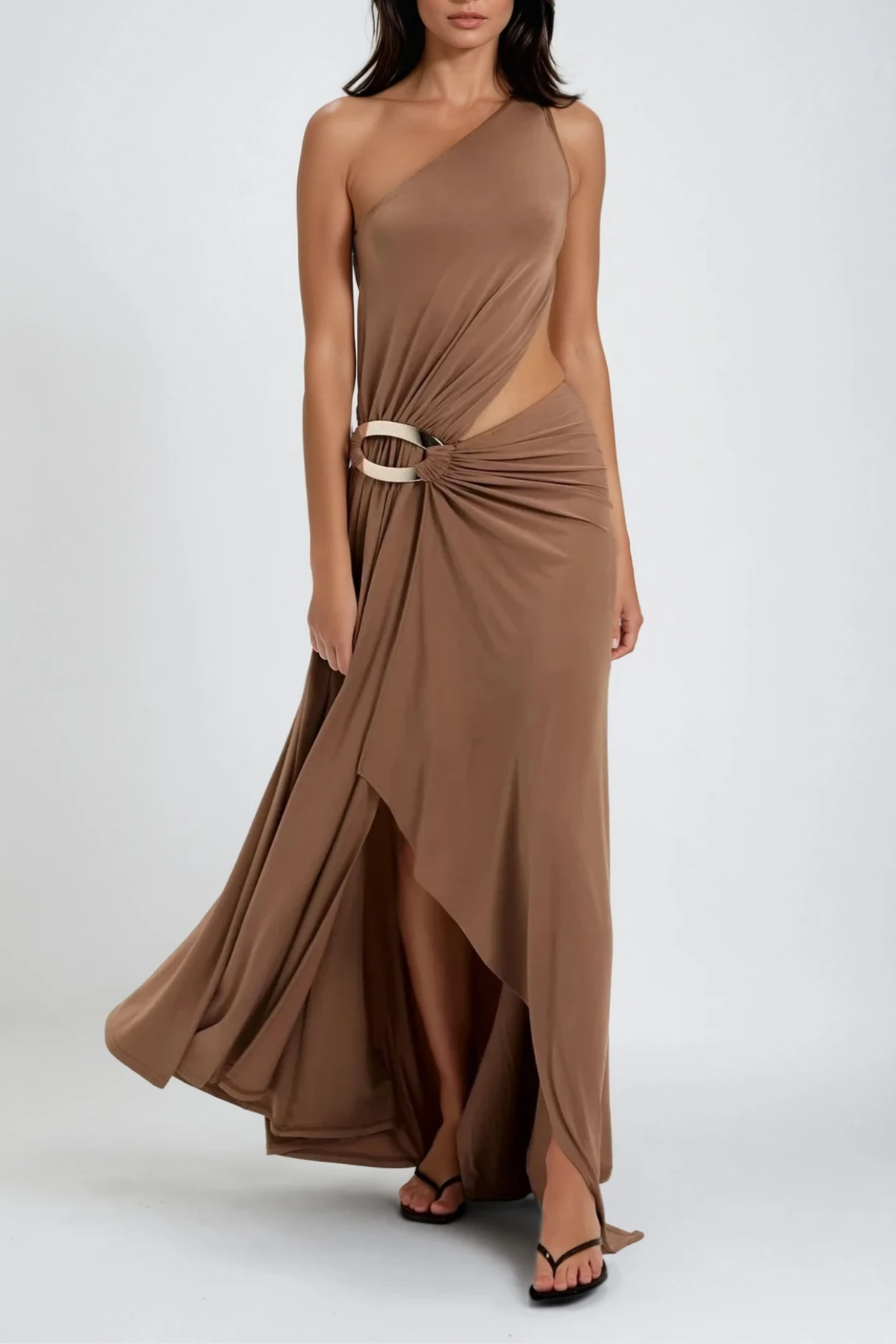 Pryndis One Shoulder Ruch Maxi Dress In Brown