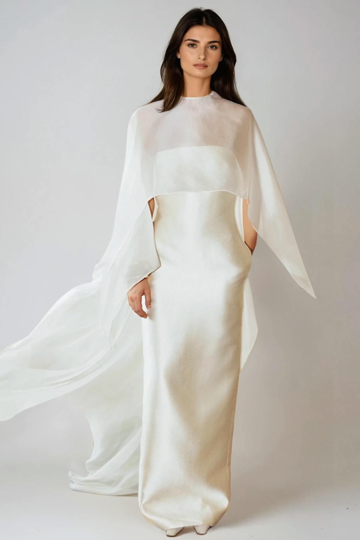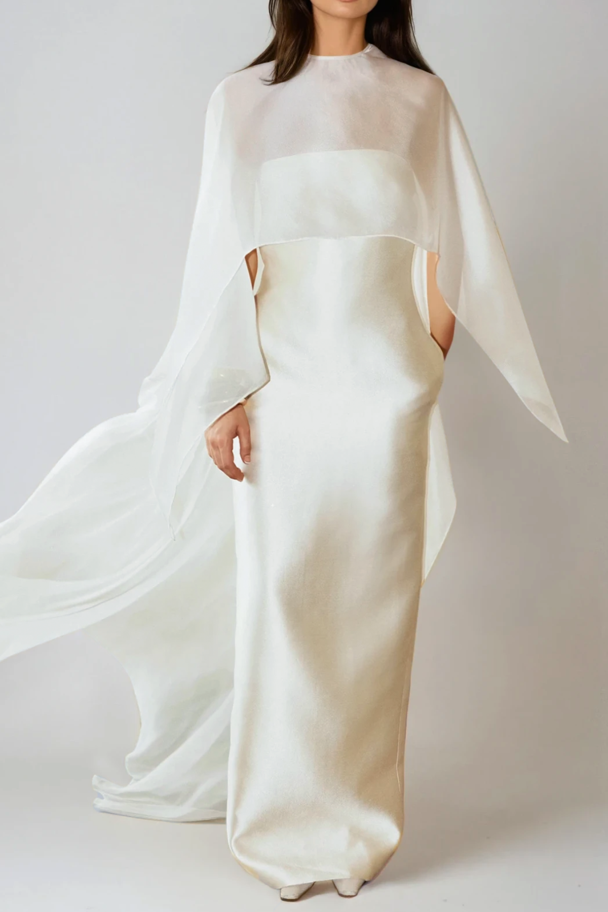 Fallon Mesh Shawl Silky Maxi Dress In White