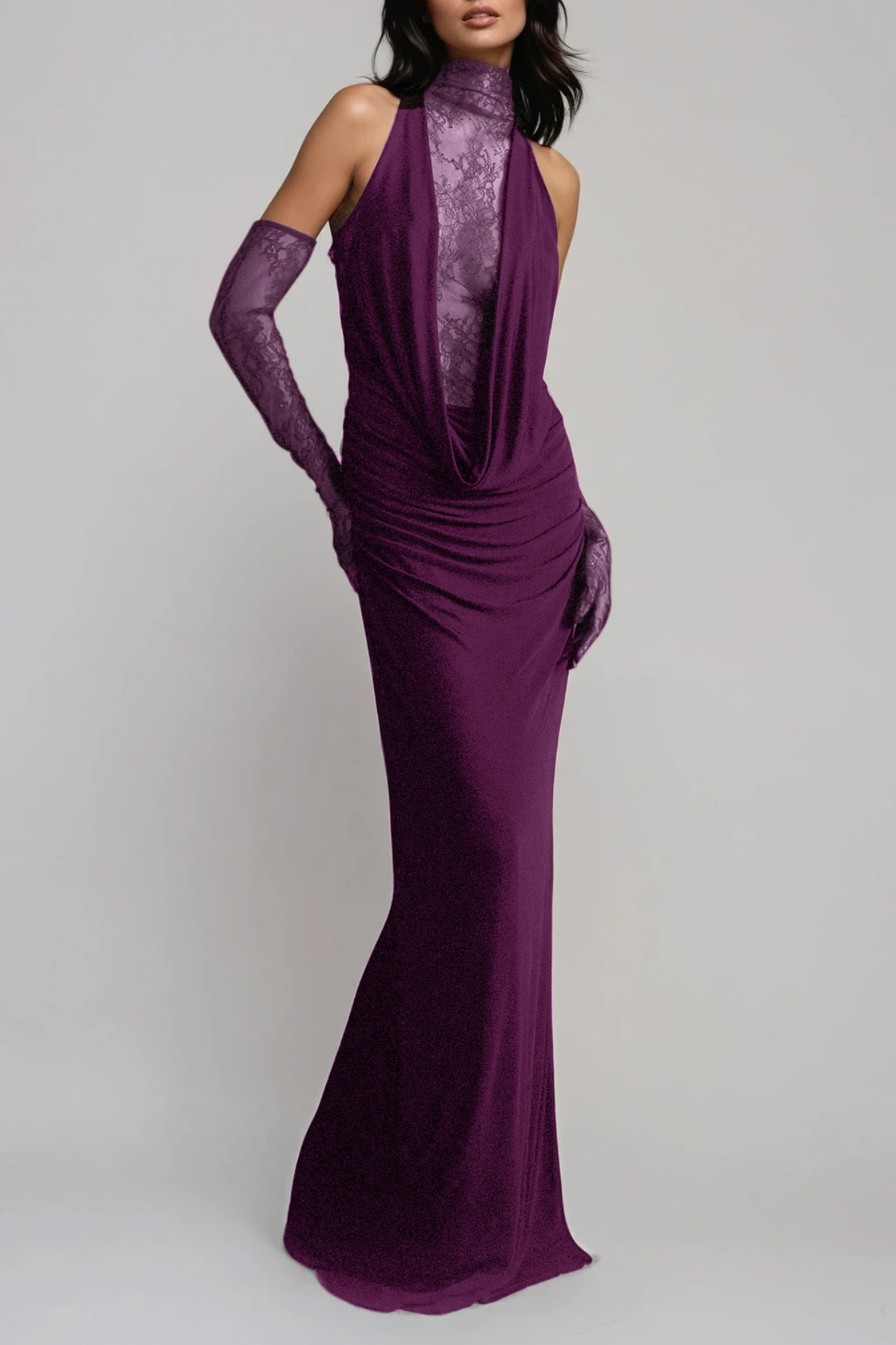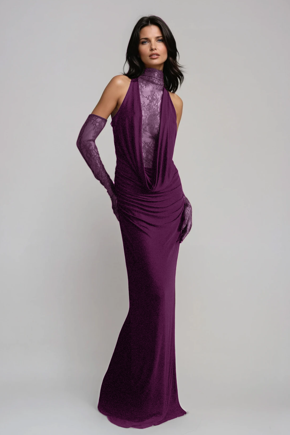 Darleen Cowl Neck Ruch Lace Maxi Dress In Purple