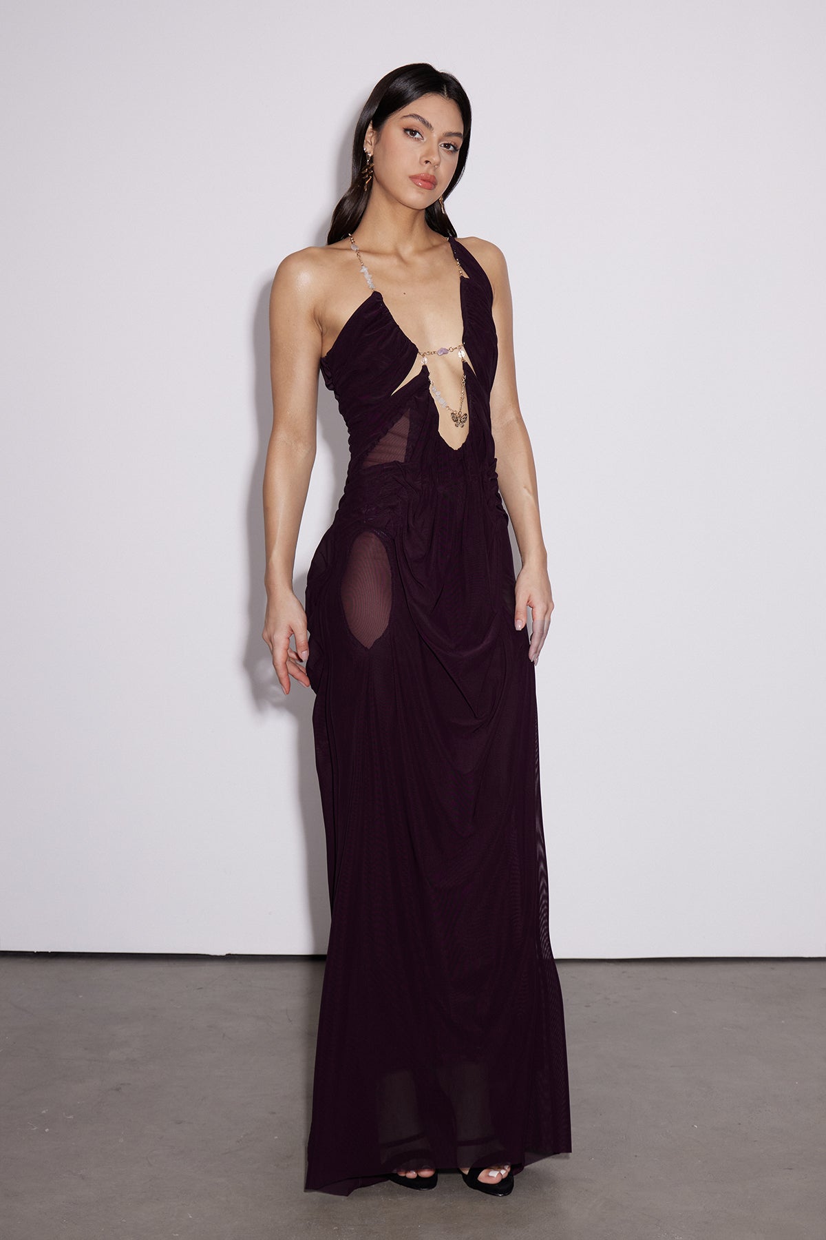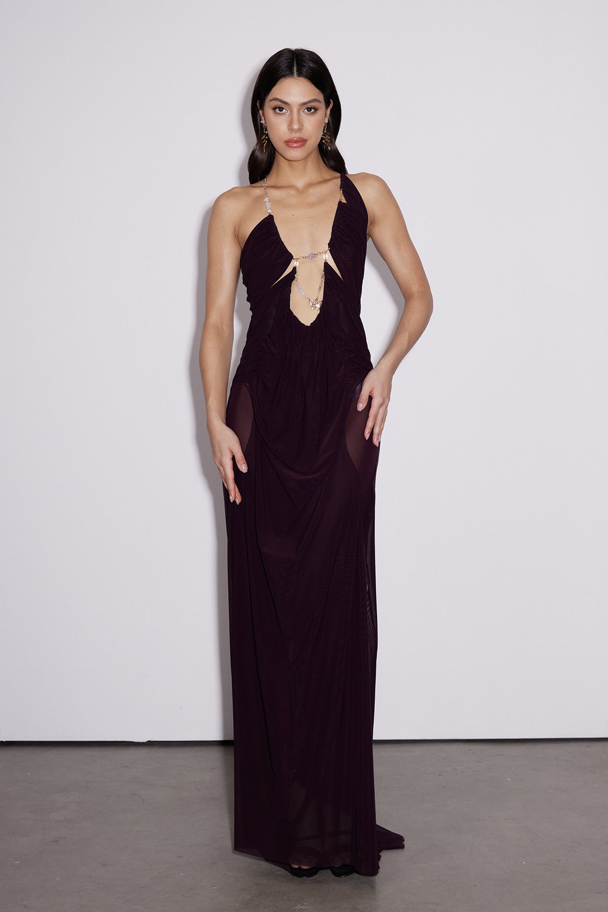 Davis Plunge Chain Asymmetric Maxi Dress In Deep Purple