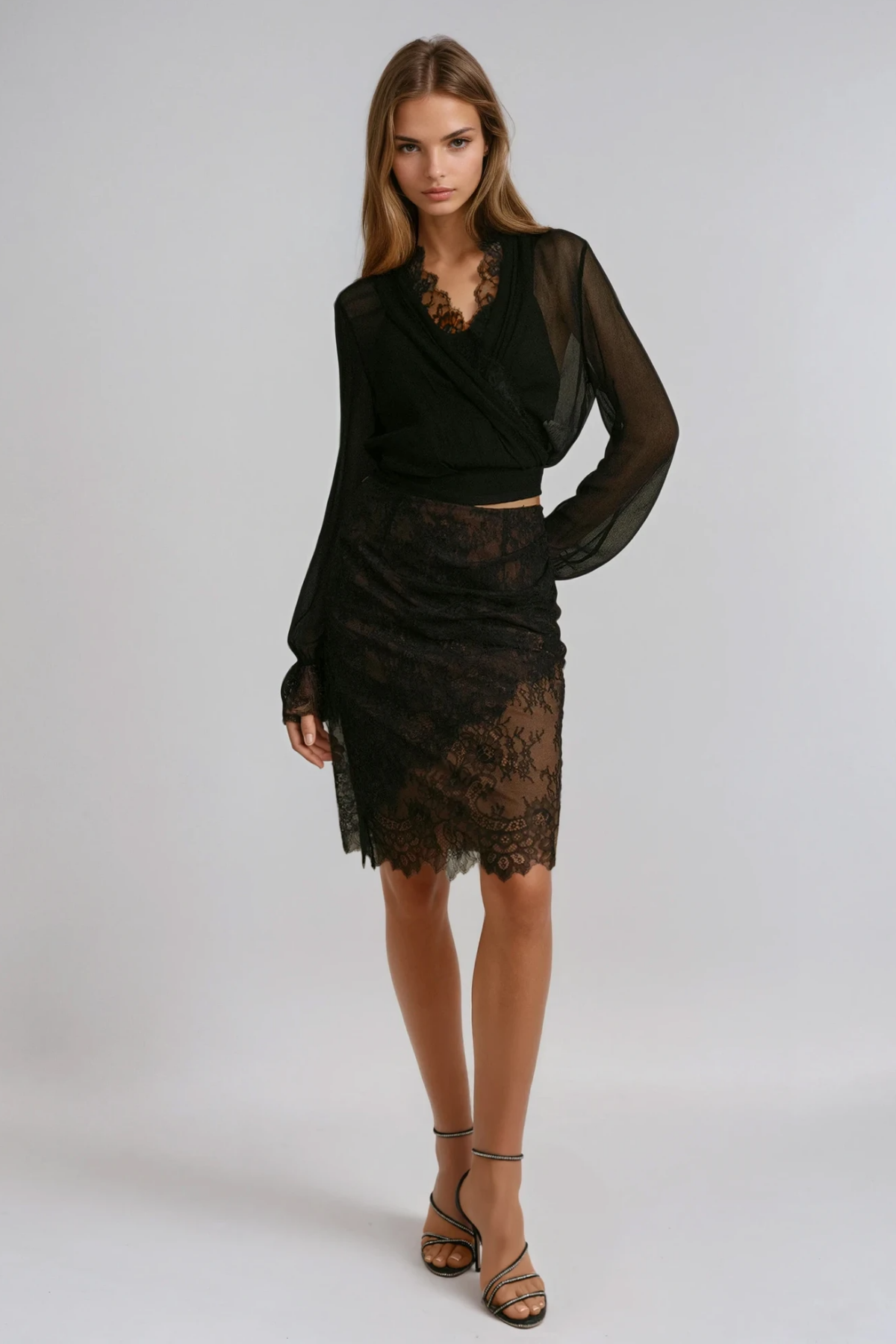 Dario V Neck Lace Skirt Set In Black