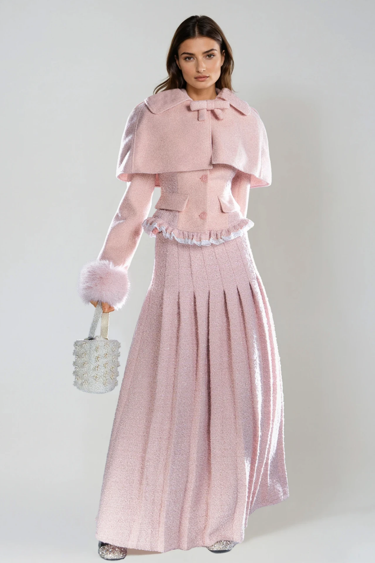 Dusty Faux Fur Three Piece Sequin Skirt Set In Pink