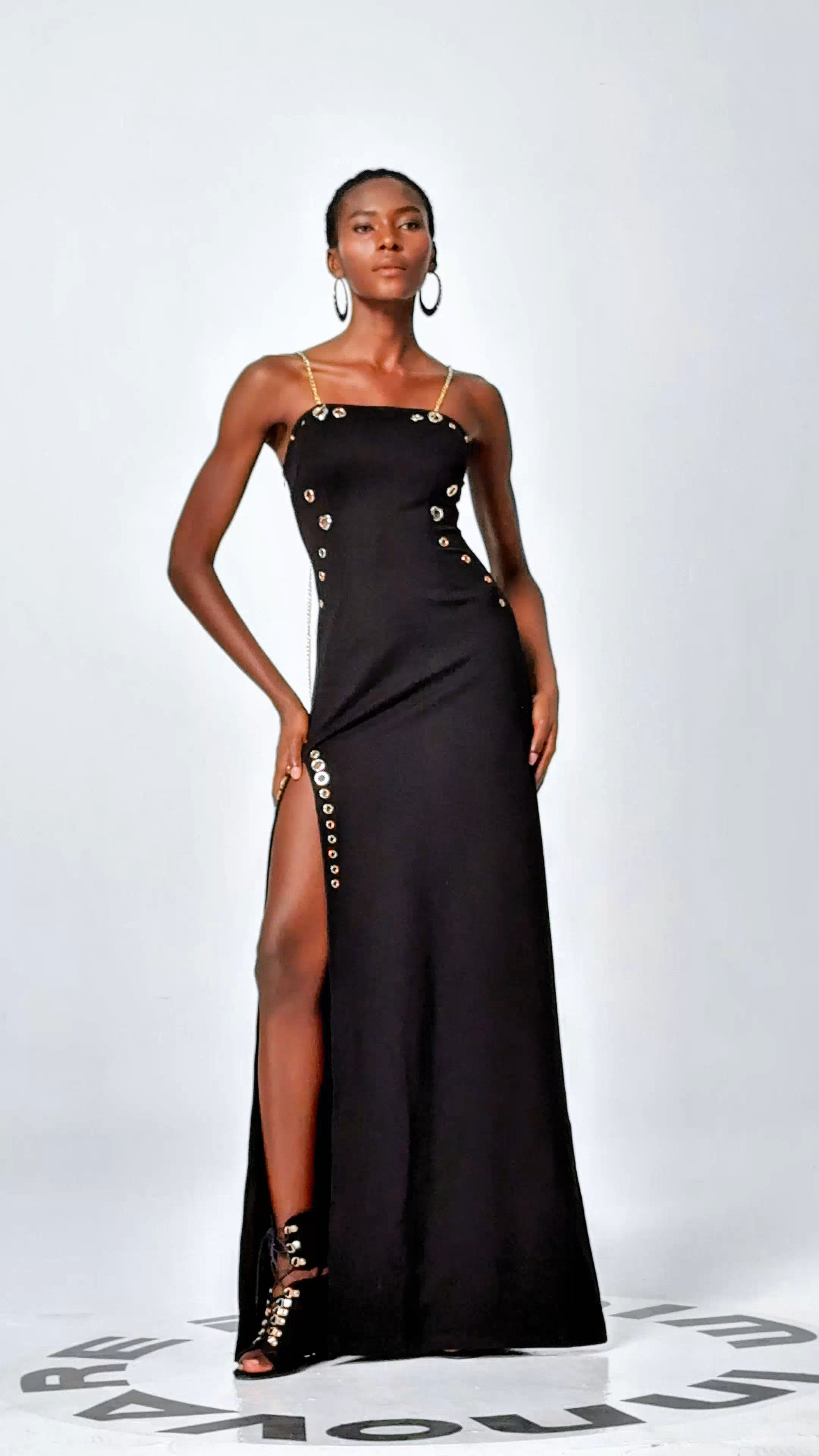 Introducing the Balbus Chain Split Embellished Maxi Dress. Combining style and comfort, this dress features a chain split design for added elegance. The embellished details add a touch of sophistication, making it perfect for any special occasion. Trust in the expertise of this dress to elevate your wardrobe.