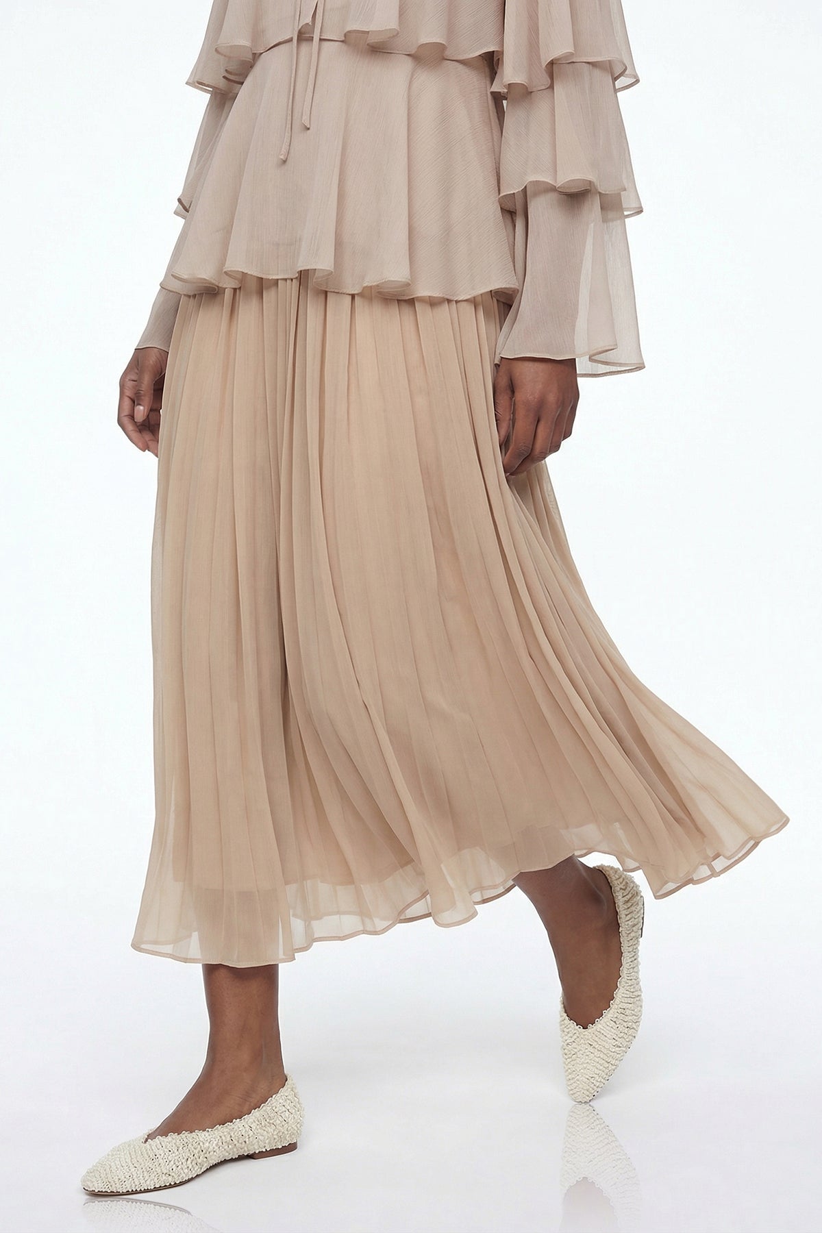 The Elizaveta Ruffle Ruch Maxi Skirt combines sophisticated tailoring with romantic detailing. Featuring strategically placed ruching that flatters the silhouette and cascading ruffles that add movement and dimension, this maxi skirt transitions seamlessly from day to evening wear. The high-waisted design elongates the frame while the flowing fabric drapes elegantly with every step. Perfect for those seeking a polished piece that balances structure with feminine grace.