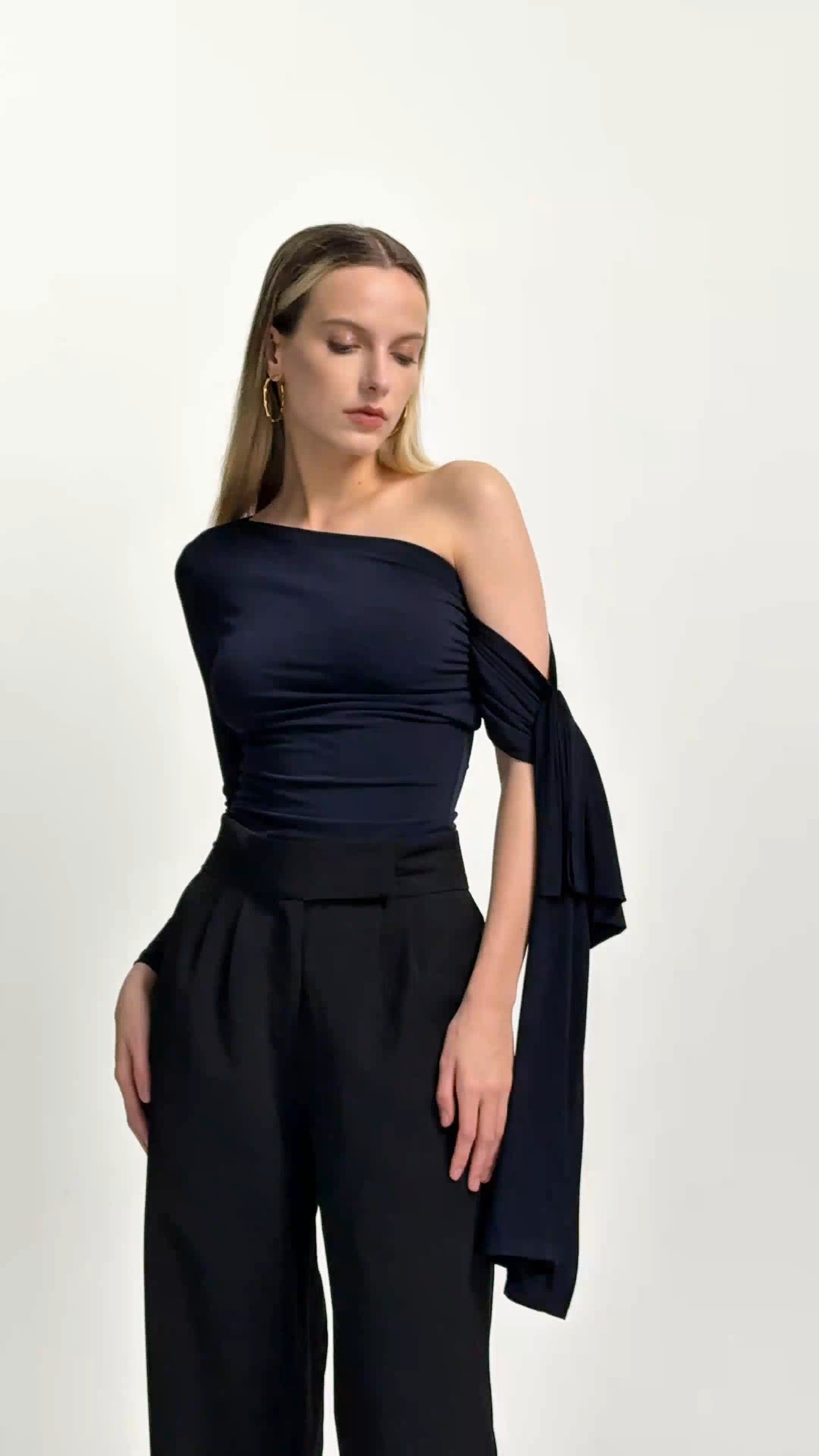 Upgrade your wardrobe with our Abia Asymmetric Single Shoulder Ruch Lace Up Top. This elegant top offers a unique asymmetrical design and stylish lace-up detailing that adds a touch of sophistication. The ruched fabric provides a flattering fit, making this top perfect for any occasion.