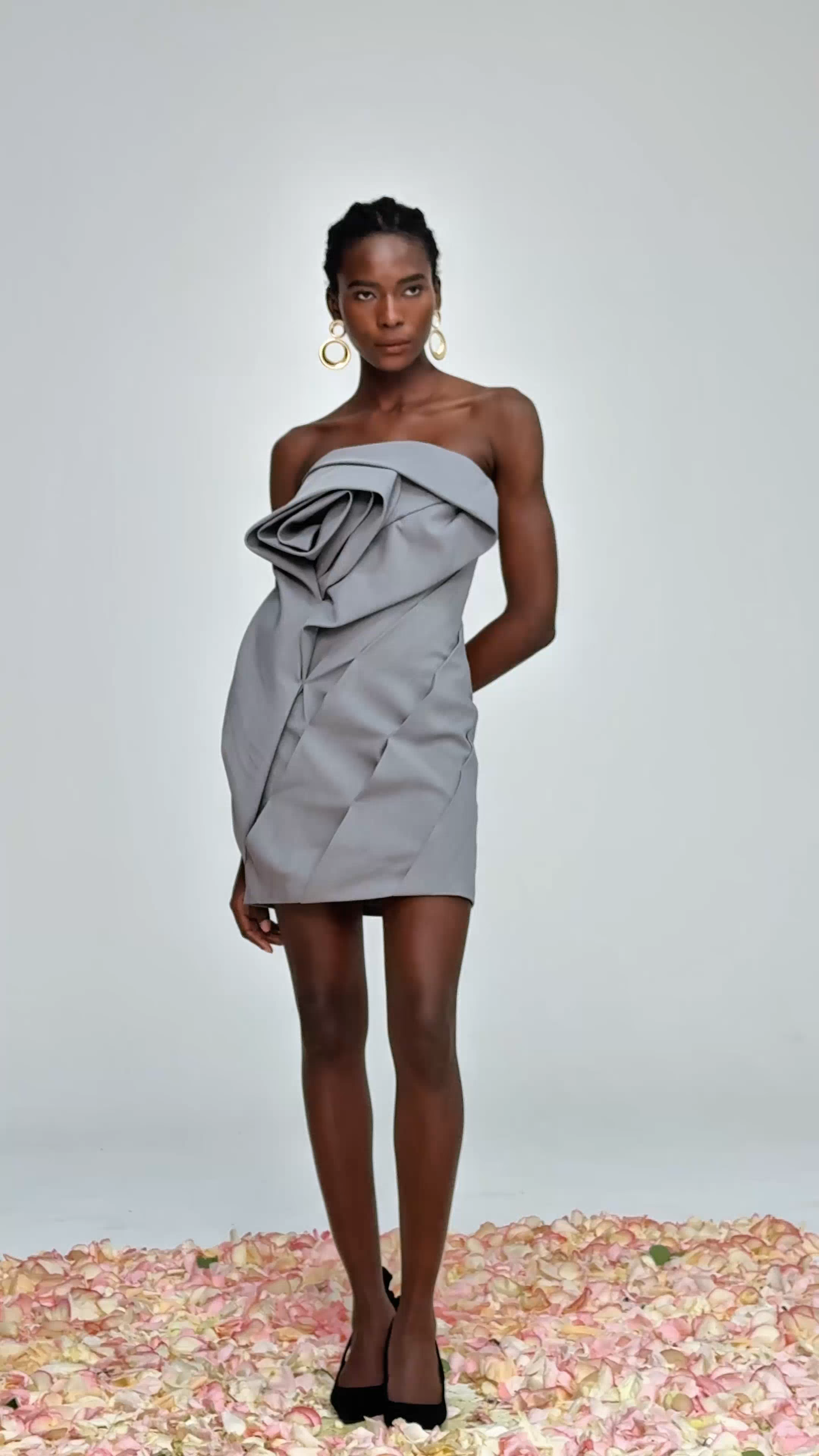 Expertly crafted and designed, the Aeronwen Flower Strapless Ruch Mini Dress in Grey combines stylish femininity with effortless charm. Its ruched details and strapless design create a flattering silhouette that's perfect for any occasion. Made with the highest quality materials, this dress is both comfortable and elegant, making it a must-have addition to your wardrobe.