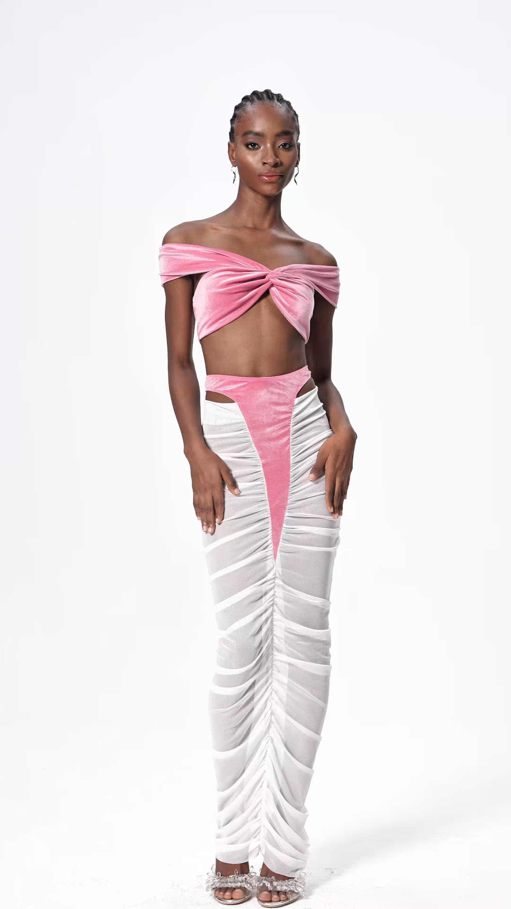 Elevate your wardrobe with the Dobri Crop Cutout Mesh Skirt Set in Pink. This contemporary two-piece combines a fitted crop top with strategic cutout detailing and a coordinating mesh skirt for a bold, fashion-forward silhouette. The sheer mesh fabric adds dimension and movement, while the cutout elements create visual interest and modern appeal. Perfect for making a statement at events, nights out, or whenever you want to showcase your confident style. The soft pink hue offers versatility while maintaining an undeniably chic aesthetic.