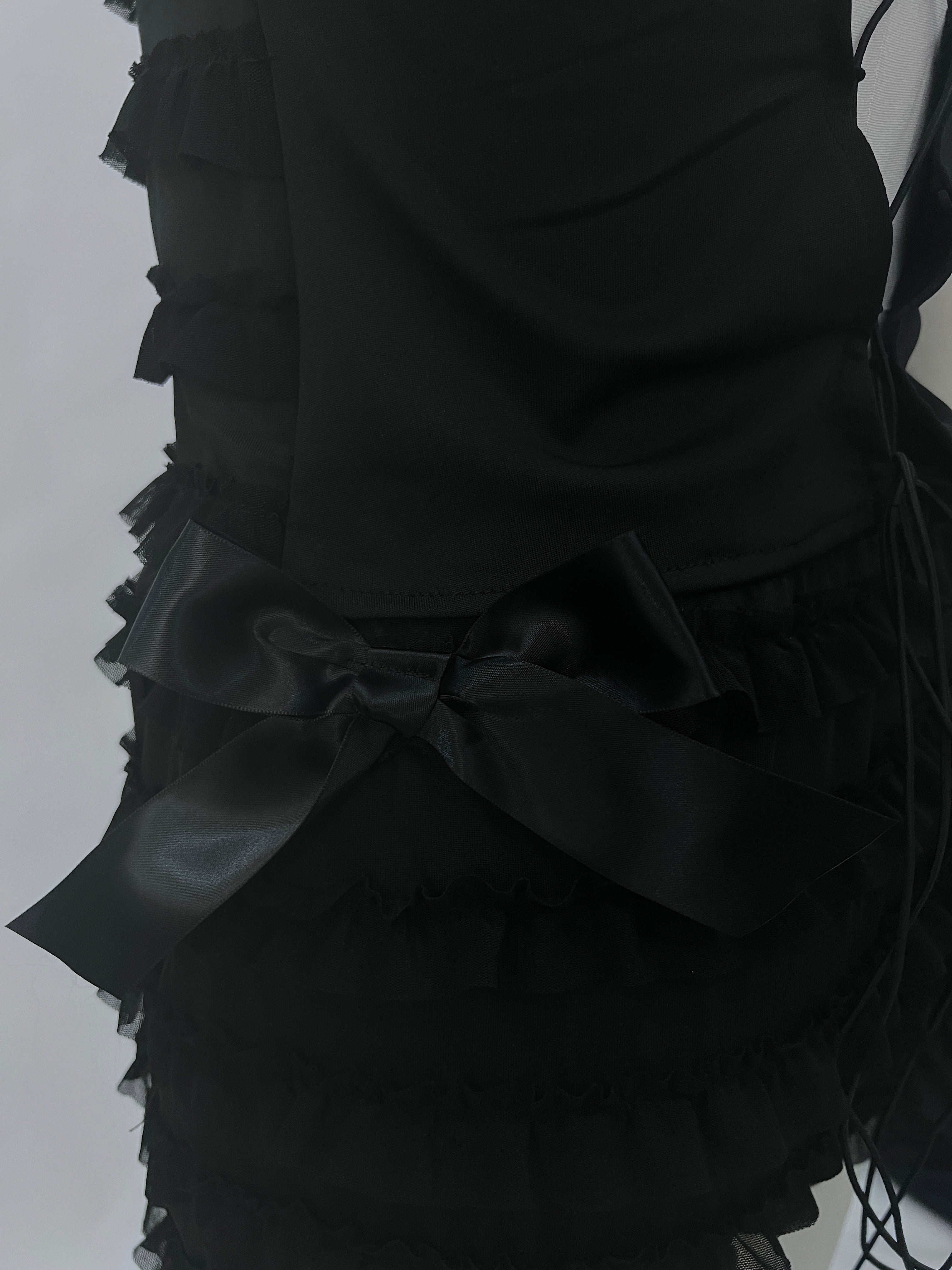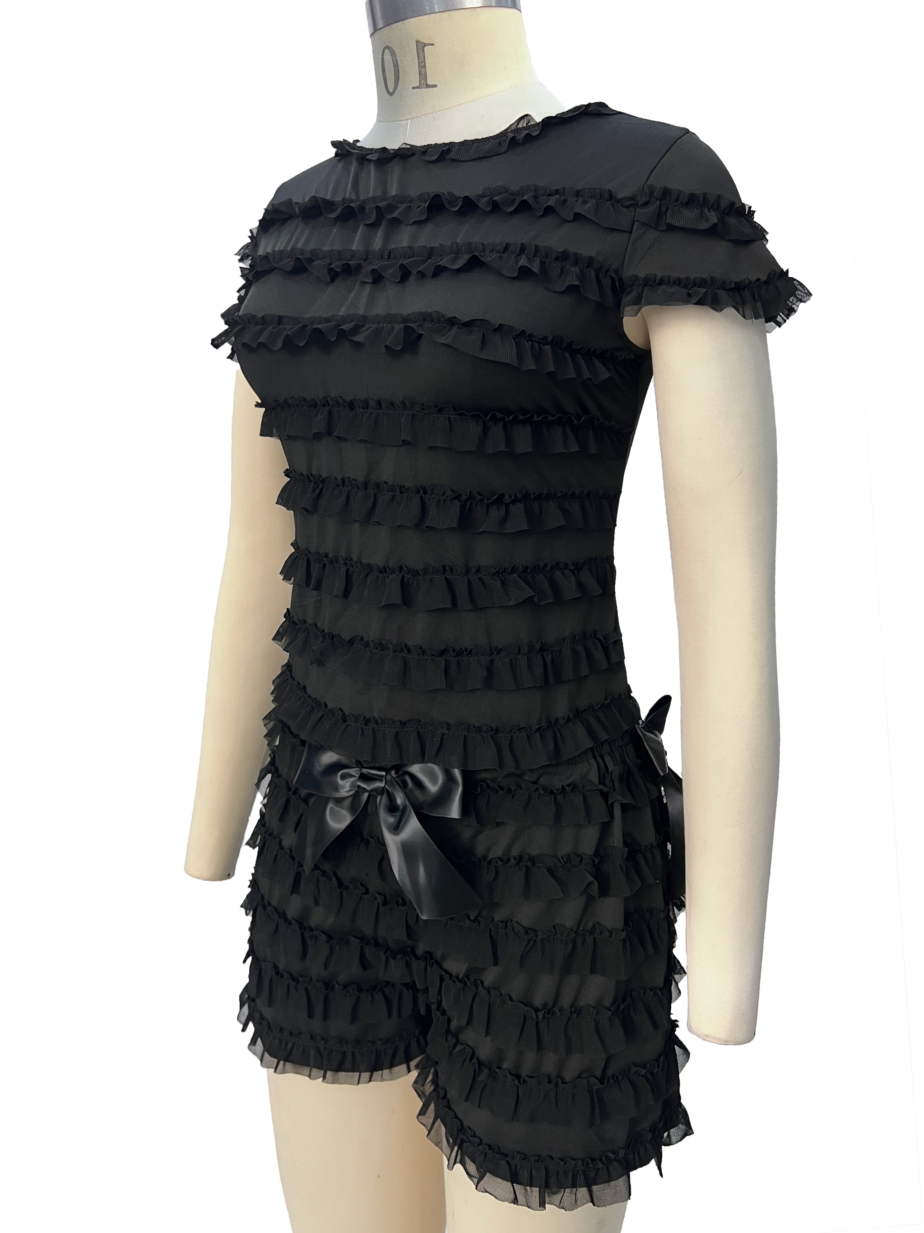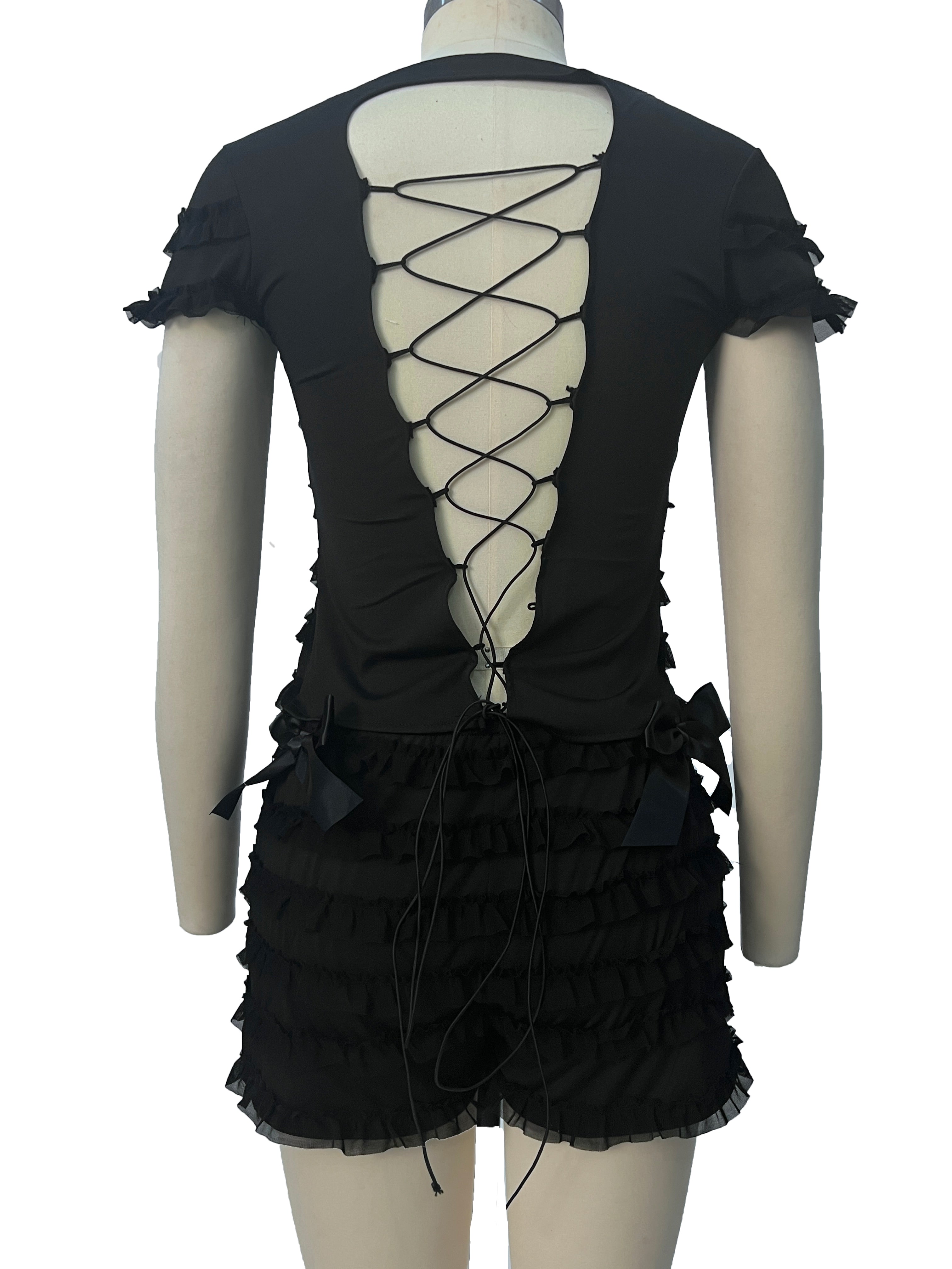 Introducing the Lillie Lace Up Backless Set In Black. This stylish set features a unique ruffled design and a daring backless cut. Made with high-quality materials, this set offers both comfort and style. Perfect for any occasion, it's a must-have for any fashion-forward individual looking to make a statement.