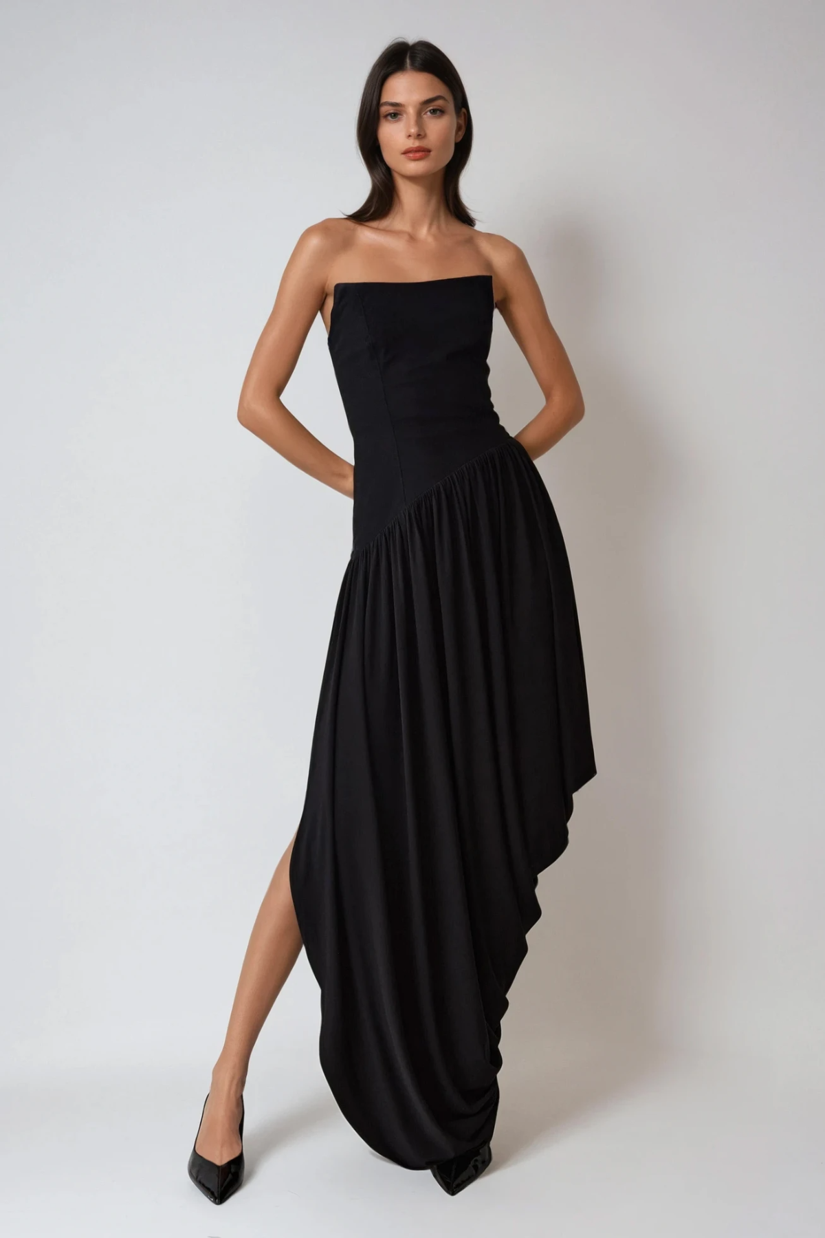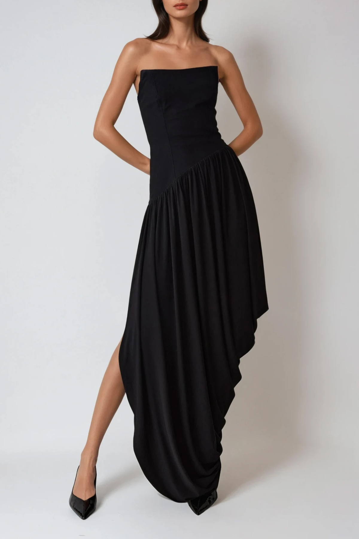 Dru Strapless Asymmetric Draped Maxi Dress In Black