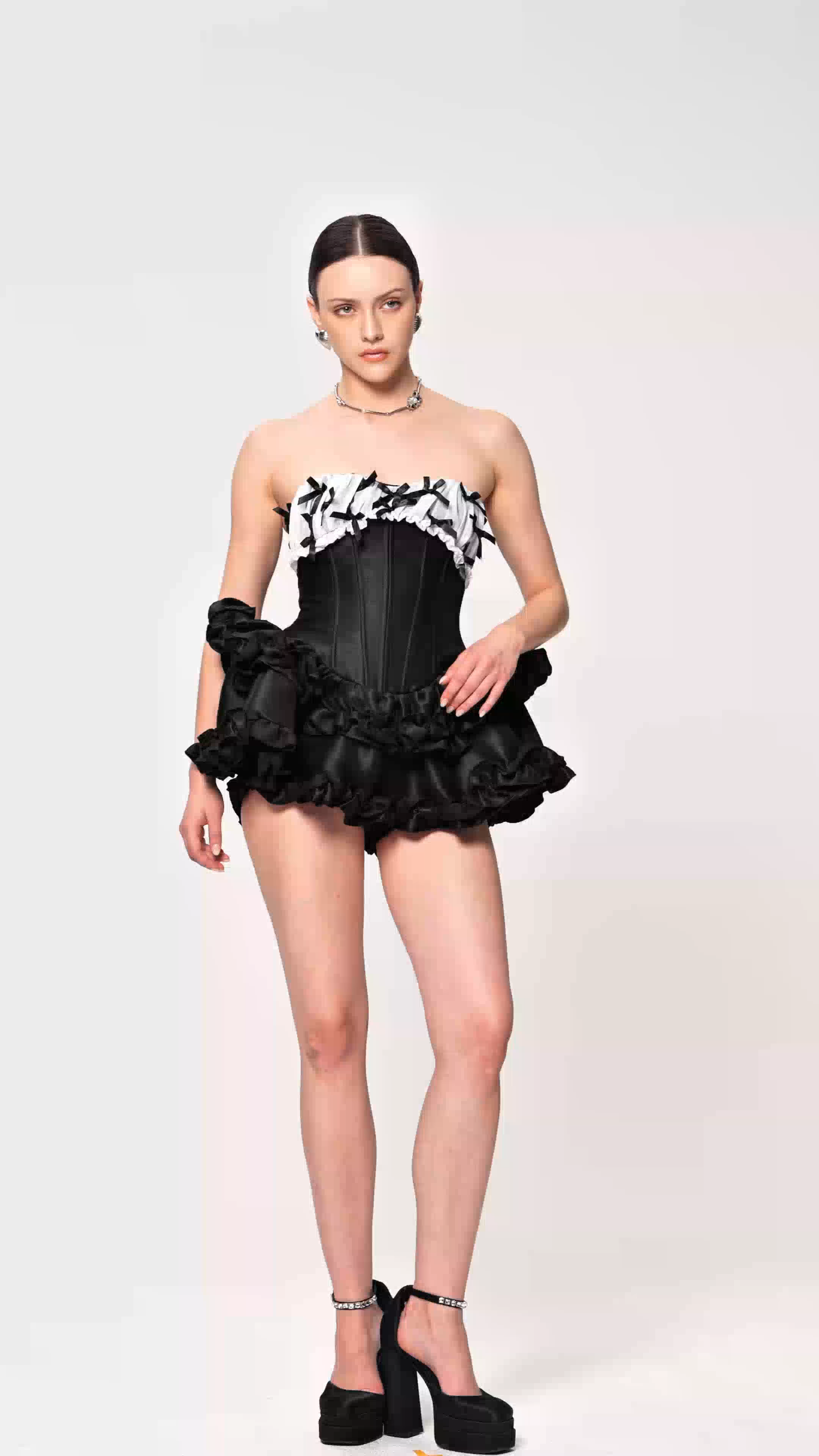 The Daxton Strapless Corset Puffy Mini Dress in Black combines structured elegance with contemporary silhouette. This piece features a fitted corset bodice that provides support and definition, paired with voluminous puffed skirt for dramatic movement and visual impact. The strapless neckline creates a sophisticated, versatile look suitable for evening events, parties, or statement occasions. Crafted for those seeking bold, fashion-forward pieces that balance architectural tailoring with romantic volume. Perfect for making an unforgettable entrance.