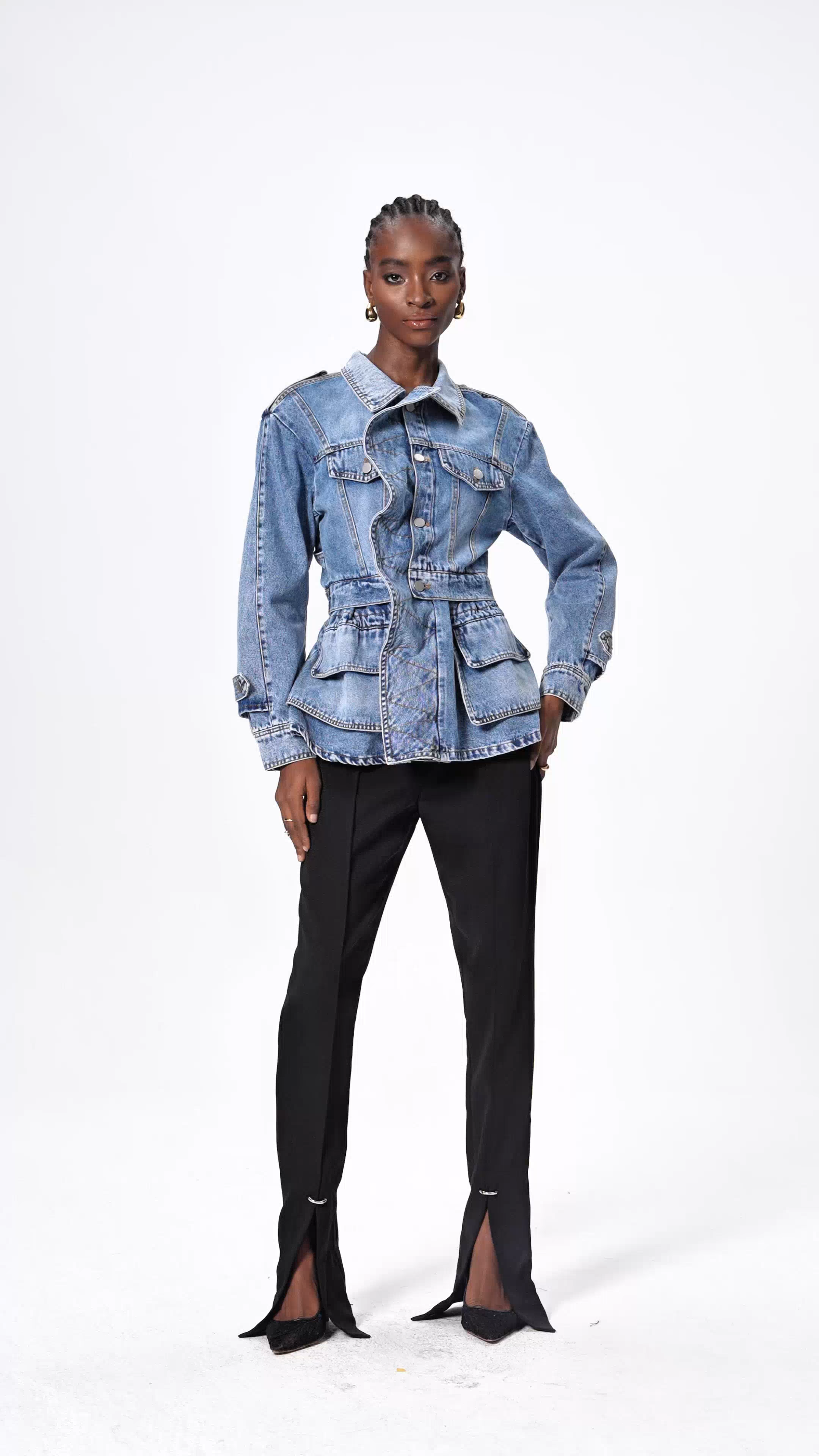 The Deniz Asymmetric Ruffle Denim Jacket redefines classic denim with a modern twist. Featuring a distinctive asymmetric design highlighted by elegant ruffle detailing, this jacket offers a unique silhouette that enhances any outfit. Crafted from durable denim, it balances structure with feminine flair, making it an ideal choice for those seeking both style and versatility in outerwear. Perfect for layering, it complements diverse wardrobes with an expert blend of edge and sophistication.