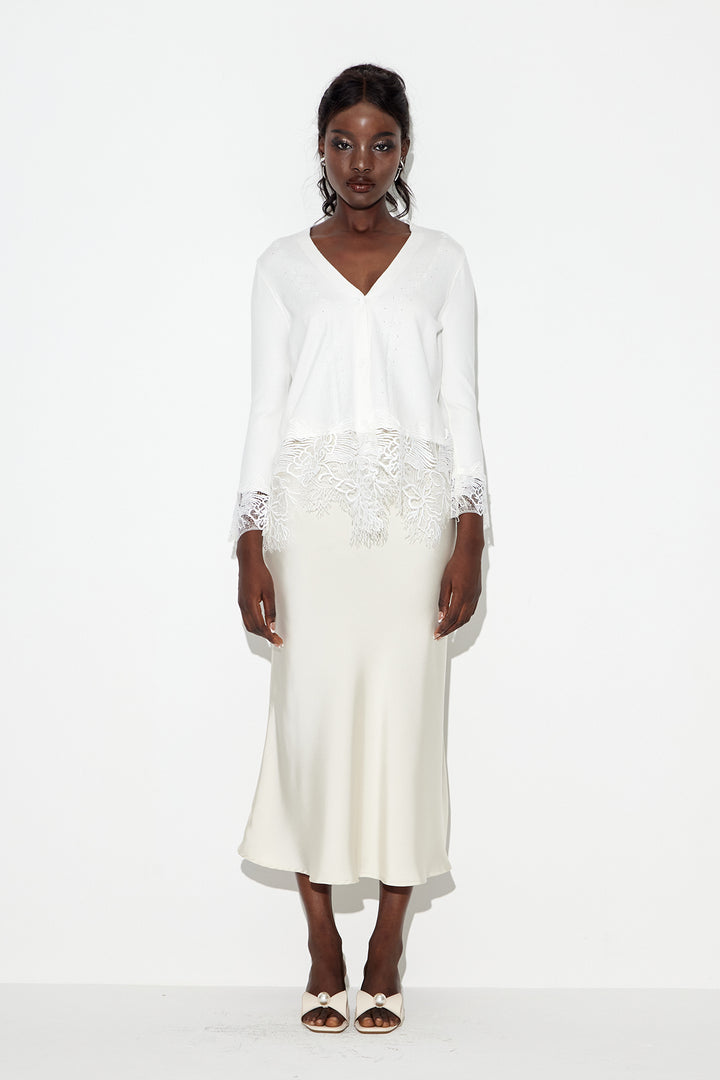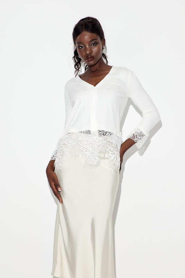 The Eadred Lace Plunge Knit Top in White combines delicate lace detailing with a flattering plunge neckline for a sophisticated yet contemporary look. Crafted from a soft knit fabric, it offers both comfort and style, making it ideal for layering or standalone wear. Its elegant design enhances your silhouette while maintaining ease of movement, suitable for both casual and dressy occasions.