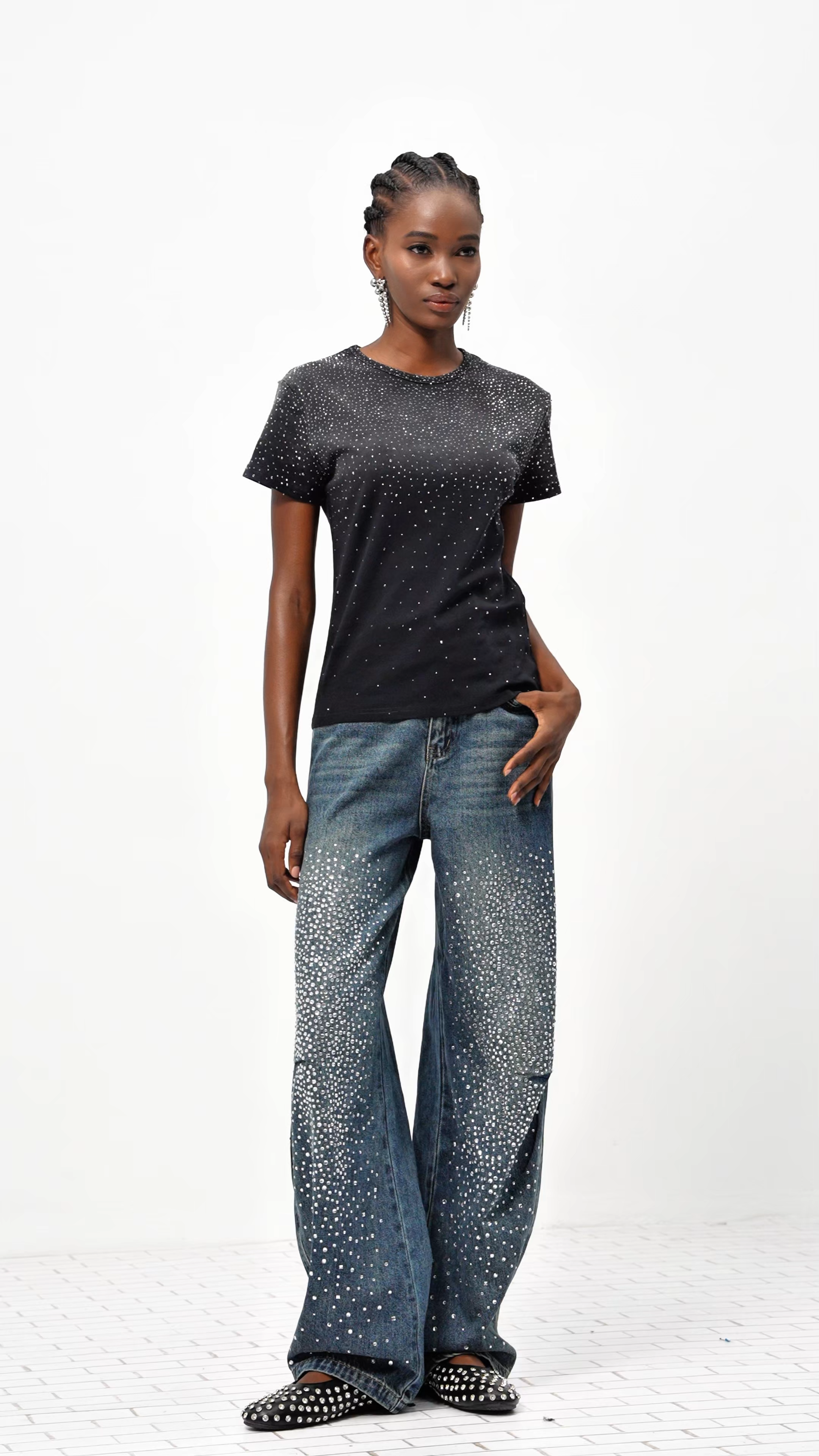 Elevate your wardrobe with Eryka Rhinestone Jeans. Crafted for both comfort and style, these jeans feature exquisite rhinestone detailing, making them an ideal choice for a sophisticated and fashionable look.