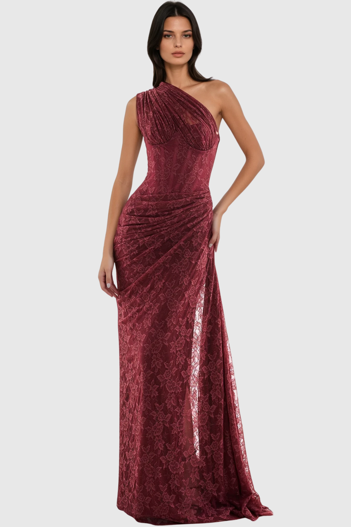 The Faron One Shoulder Corset Lace Maxi Dress combines architectural elegance with refined femininity. Featuring a structured corset bodice that sculpts and supports, this floor-length gown showcases delicate lace detailing and an asymmetrical one-shoulder neckline for contemporary sophistication. The fitted silhouette transitions into a graceful maxi skirt, creating a striking silhouette suitable for evening events, galas, or formal occasions. Premium construction ensures both comfort and confidence, making this piece a versatile investment for your occasion wear collection.