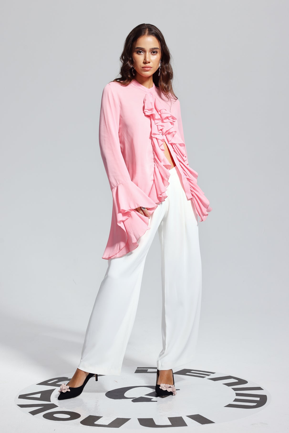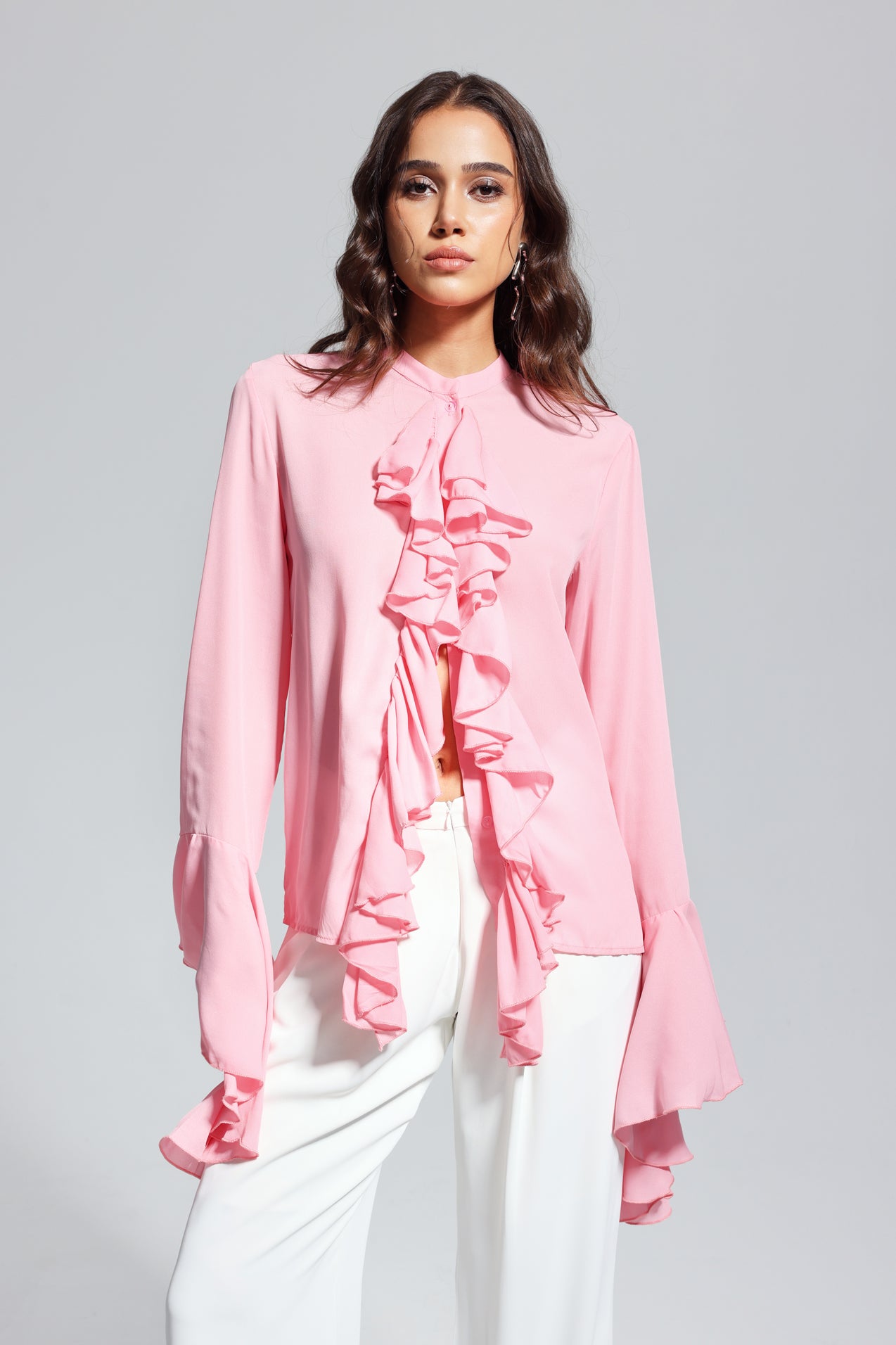 Upgrade your wardrobe with the Mandy Ruffle Split Asymmetric Top. This top features a unique split and asymmetric design, bringing a touch of elegance to your outfit. Made with quality materials, this top is both fashionable and comfortable, perfect for any occasion. Stand out from the crowd and elevate your style with this must-have piece.
