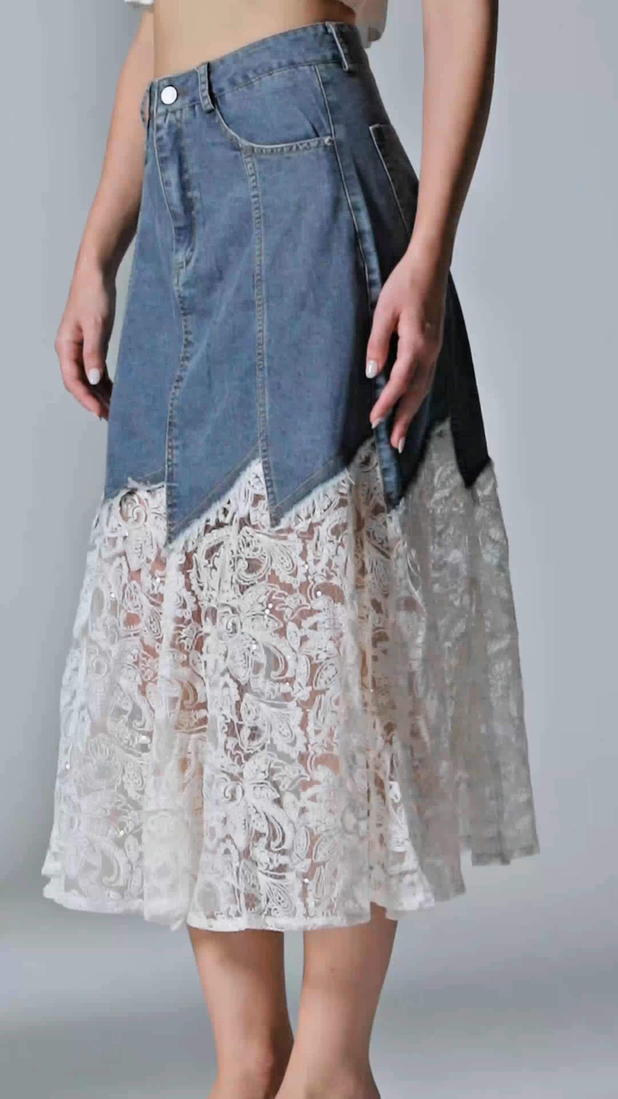 The Cain Lace Denim Midi Skirt expertly blends classic denim durability with delicate lace detailing, offering a sophisticated yet edgy silhouette. Its midi length provides versatile styling options, suitable for both casual and refined looks. Crafted for comfort and style, this skirt elevates your wardrobe with a unique fusion of textures that highlight expert design and quality craftsmanship.