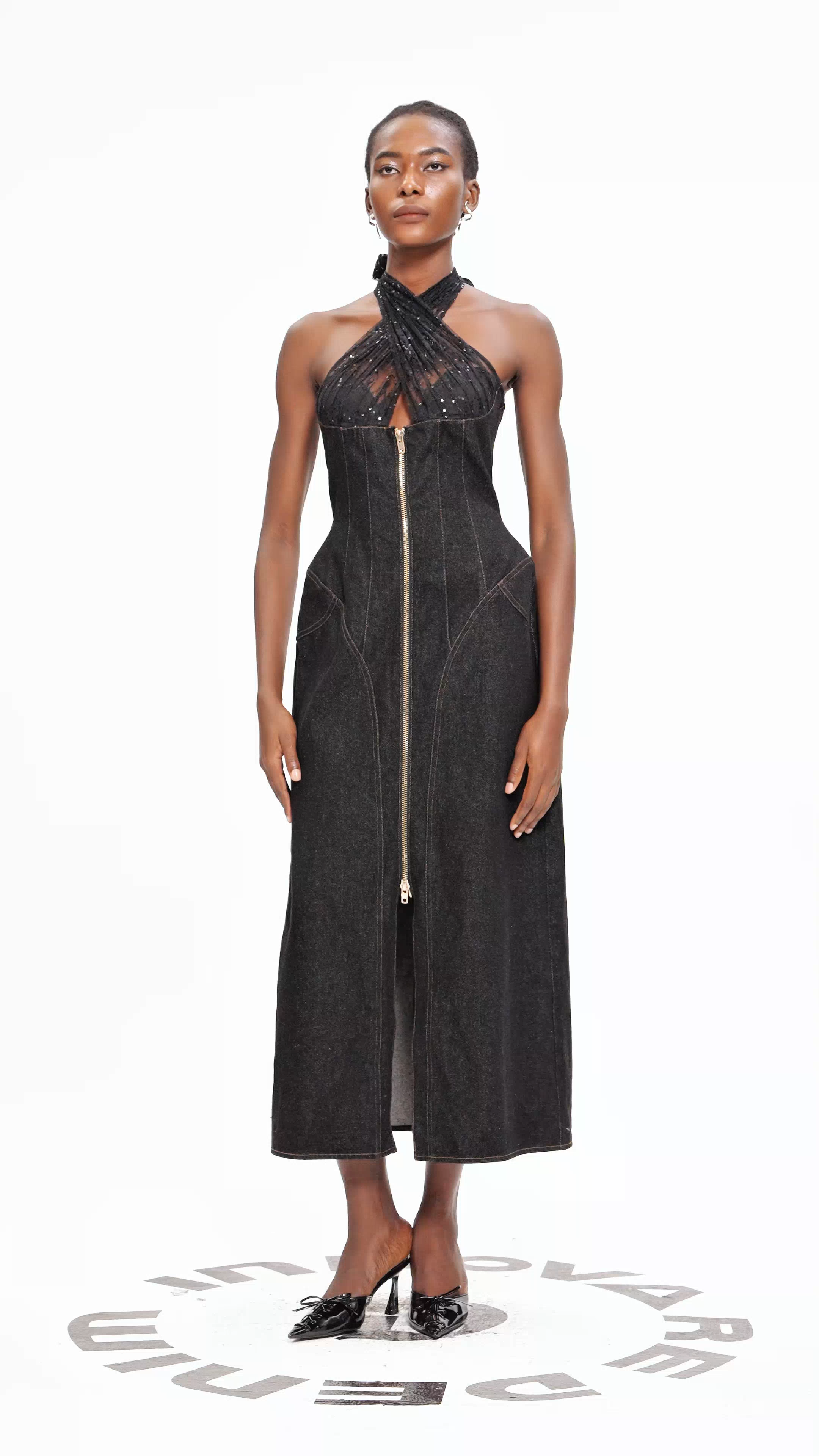 Elevate your evening attire with the Connell Sequin Halter Neck Denim Maxi Dress. This expertly crafted gown combines the casual appeal of denim with the refined glamour of sequins, featuring a halter neck design that enhances the neckline and silhouette. Its maxi length offers a graceful, elongating effect, making it ideal for upscale events that require a unique yet sophisticated look. Perfectly balancing comfort and style, this dress is a standout piece for any fashion-forward wardrobe.