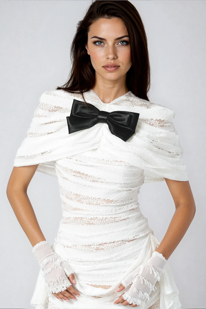 Djihan Ruch Bow Lace Mini Dress This sophisticated mini dress combines delicate lace detailing with strategic ruching for a flattering silhouette. The signature bow accent adds an elegant finishing touch, while the refined construction ensures polished versatility. Perfect for elevated occasions or styled down for contemporary everyday wear, this piece delivers timeless appeal with modern sensibility.