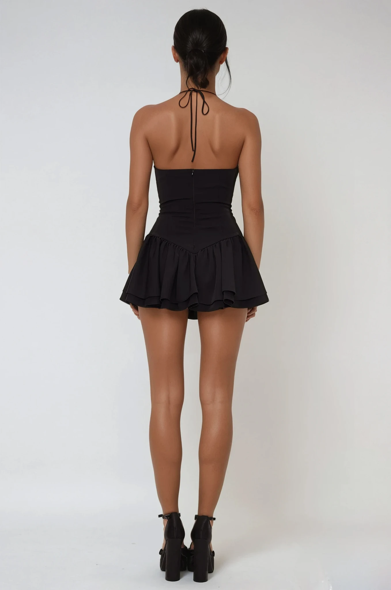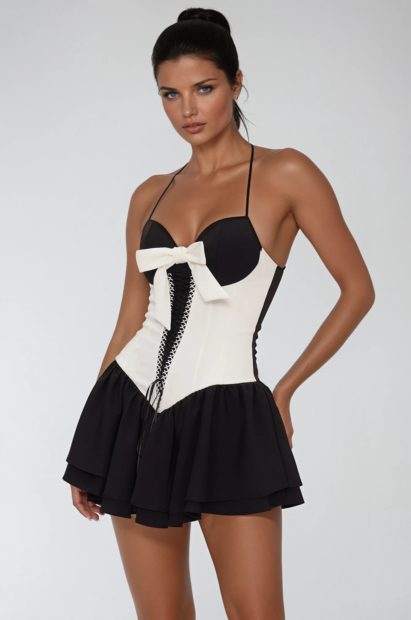Eitan Lace Up Corset Ruffle Mini Dress This striking mini dress combines structured corsetry with romantic ruffled detailing for a bold, fashion-forward silhouette. The lace-up corset bodice provides a sculpted fit and adjustable support, while cascading ruffles add movement and dimension to the skirt. Perfect for making an entrance at evening events, parties, or when you want to command attention. The contrast between the fitted corset and voluminous ruffles creates a dynamic look that balances elegance with edge. An investment piece for those who embrace statement dressing.