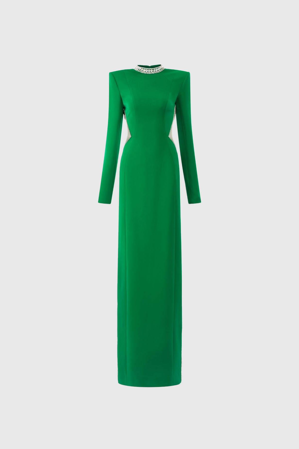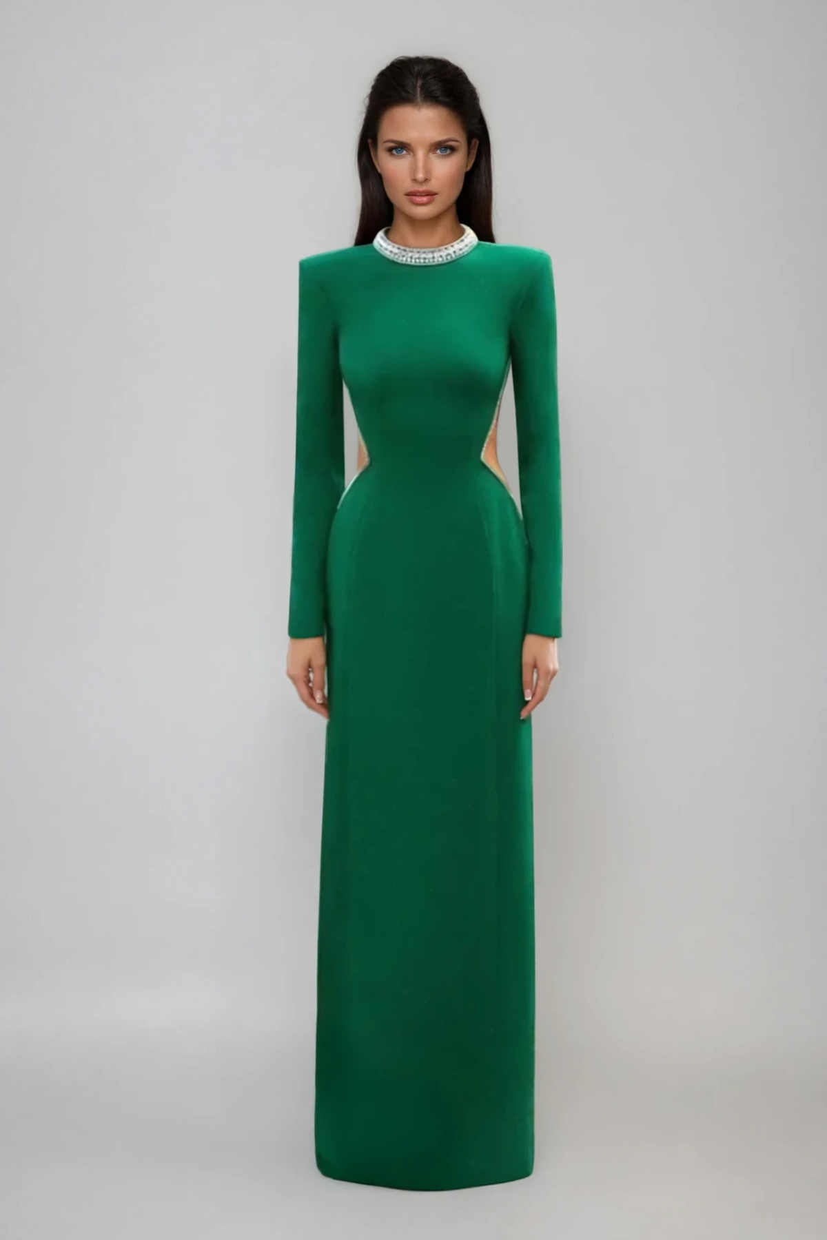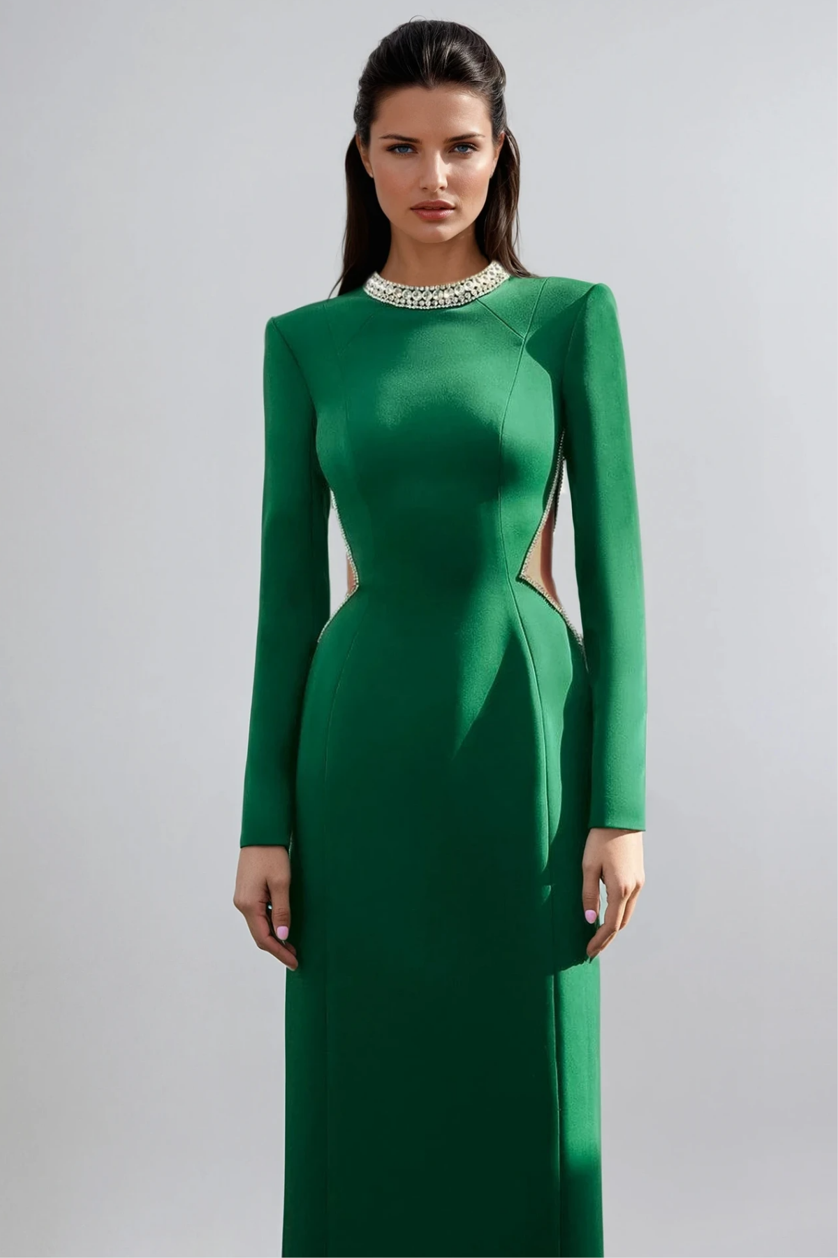 The Fakhri Crystal Cutout Maxi Dress combines sophisticated design with contemporary elegance. This floor-length silhouette features strategically placed crystal-embellished cutouts that create visual interest while maintaining refined proportions. The maxi length offers versatility for both evening events and upscale daytime occasions. Crafted with attention to detail, the crystal accents catch light beautifully, adding dimension and luxury to your wardrobe. Perfect for those seeking a statement piece that balances modern aesthetics with timeless appeal.