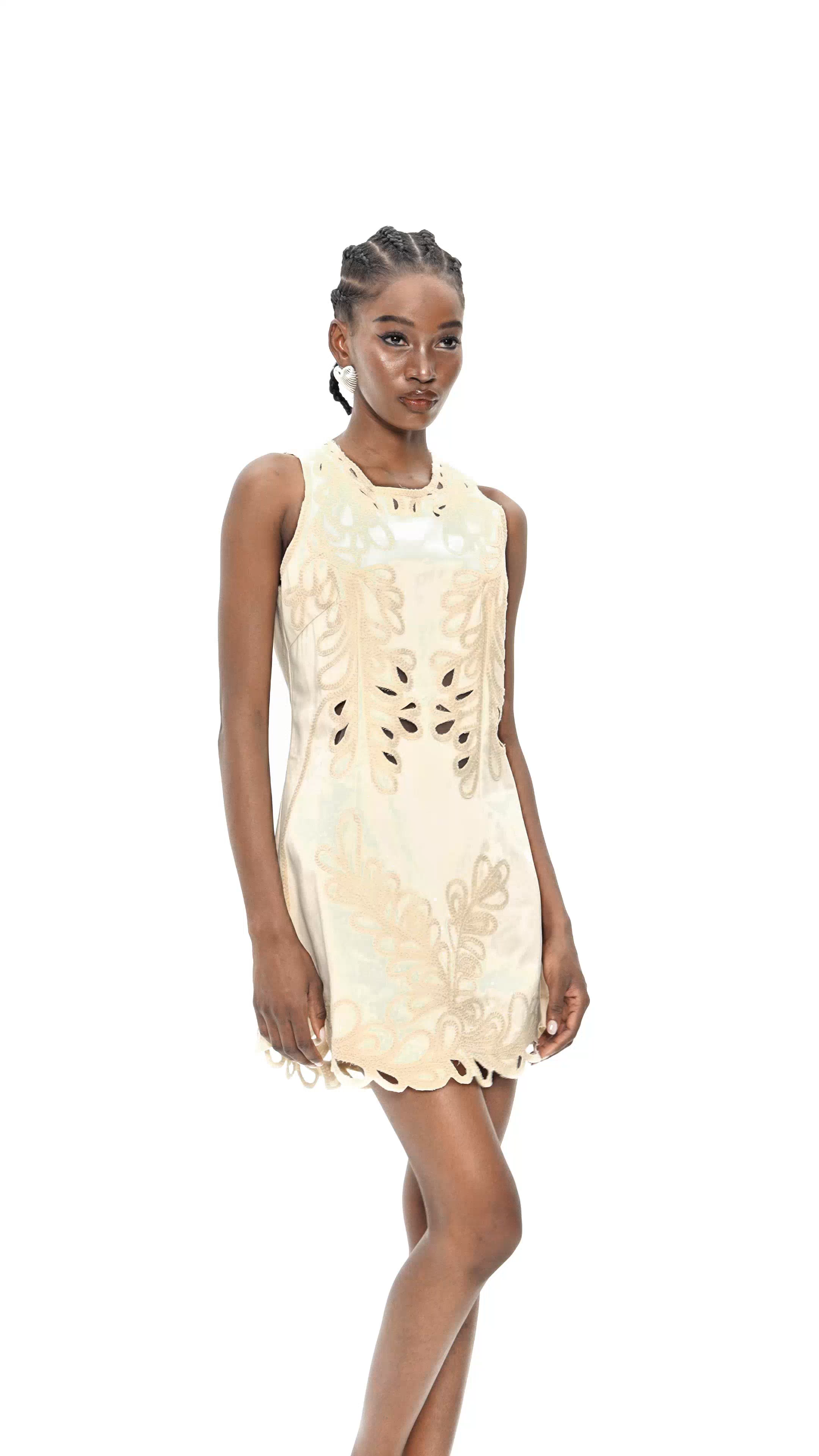 The Crescencia Embroidered Cutout Sleeveless Mini Dress combines intricate embroidery with modern cutout details for a refined yet edgy look. Crafted to flatter the silhouette, its sleeveless design enhances comfort and breathability, while the mini length adds a youthful touch. Perfect for stylish occasions, this dress balances elegance and contemporary fashion effortlessly.