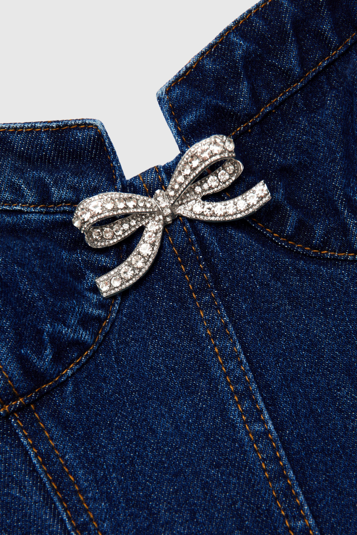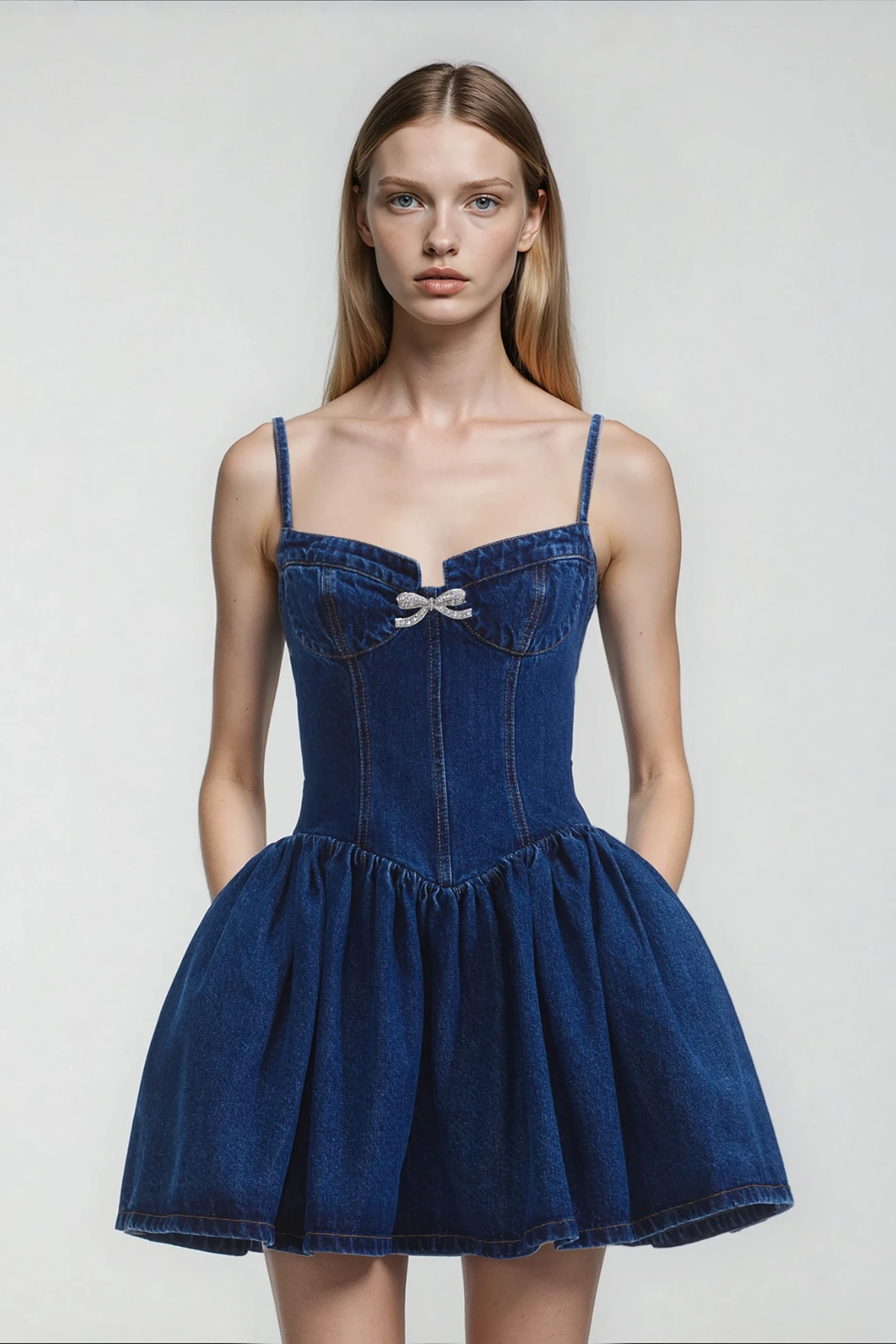 Crafted from premium denim, this mini dress features delicate ruffle detailing and intricate embellishments that elevate everyday wear into statement-worthy style. The structured silhouette flatters the figure while the ruffled accents add movement and visual interest. Perfect for transitioning from day to night, this piece pairs effortlessly with sneakers for casual outings or heels for evening occasions. The durable denim construction ensures lasting quality, making it a versatile addition to any contemporary wardrobe.