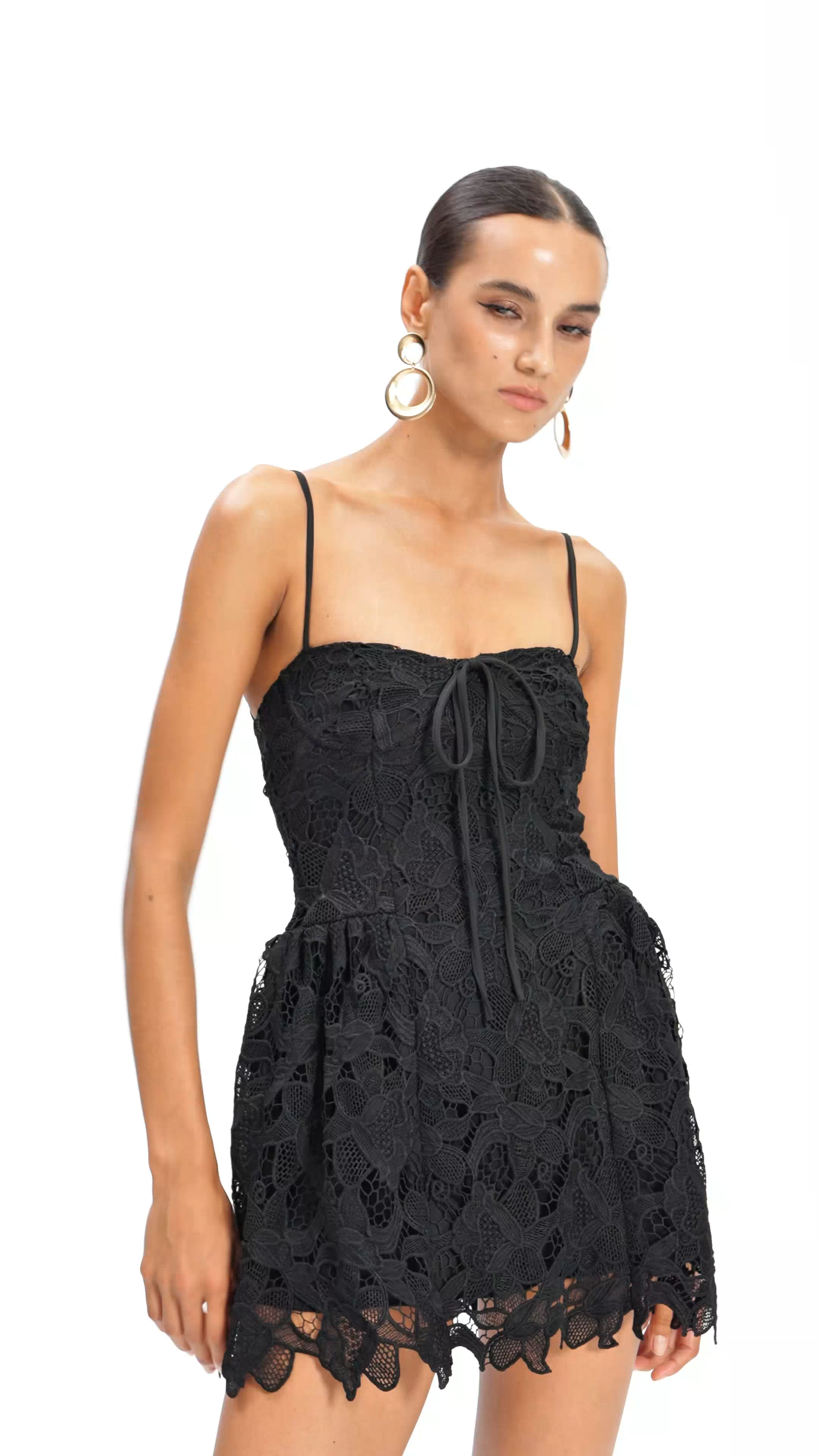 The Zamira Spaghetti Lace Mini Dress in Black combines delicate lace detailing with a sleek silhouette, offering a refined yet alluring look. Its spaghetti straps provide a minimalist touch, while the mini length enhances a modern, confident style. Perfect for evening events or upscale gatherings, this dress balances elegance and subtle sensuality with expert craftsmanship.