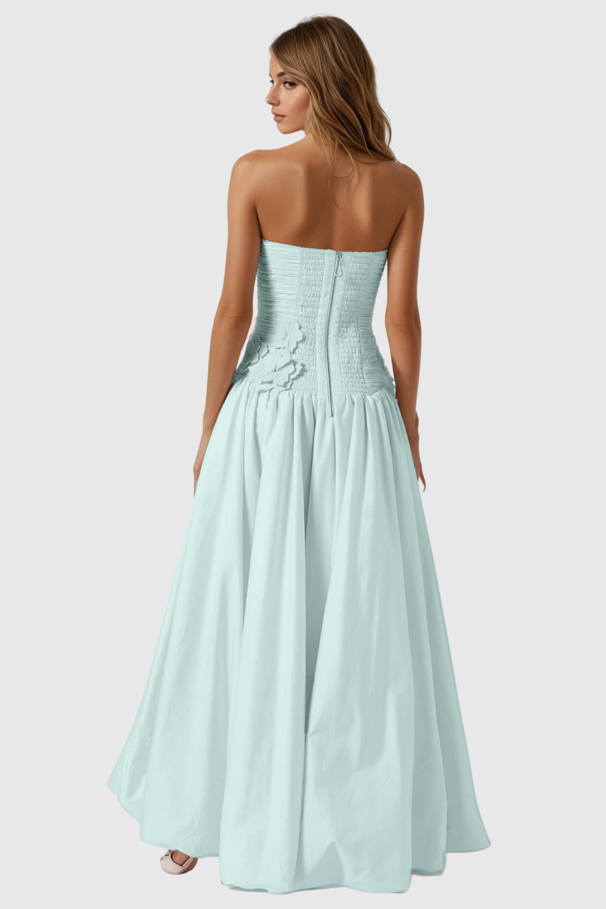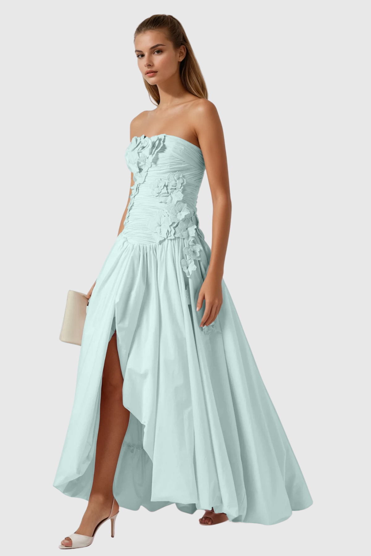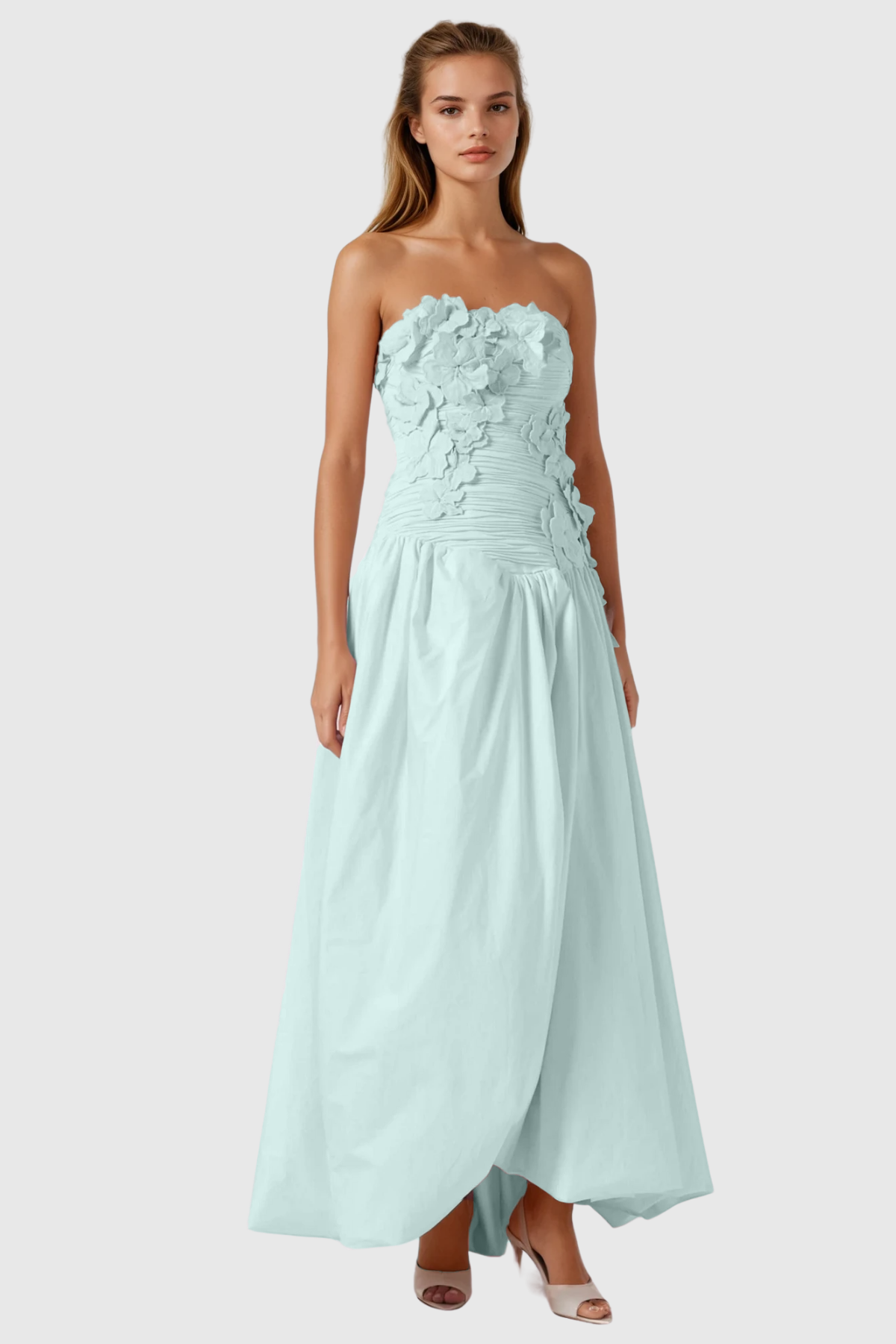 Batsheva's strapless maxi dress exemplifies refined craftsmanship with its dramatic silhouette and meticulous construction. The voluminous puffy skirt, enhanced by strategic ruching, creates dimensional movement while the strapless neckline offers sophisticated versatility. Rendered in a rich green hue, the floral detailing adds romantic complexity to this statement piece. Ideal for formal occasions, this dress balances architectural design with timeless elegance, making it a distinguished addition to any occasion wardrobe.