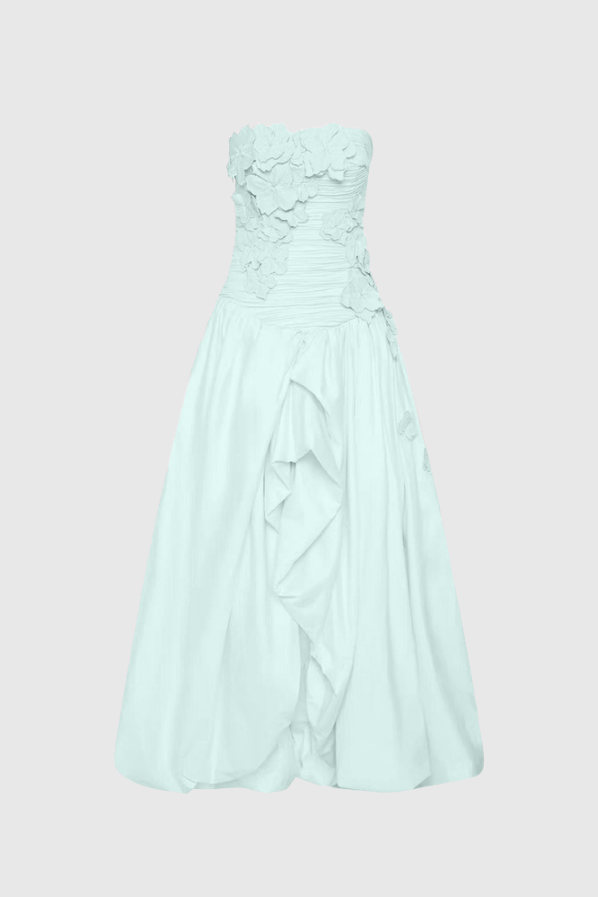 Batsheva Strapless Flower Ruch Puffy Maxi Dress In Green