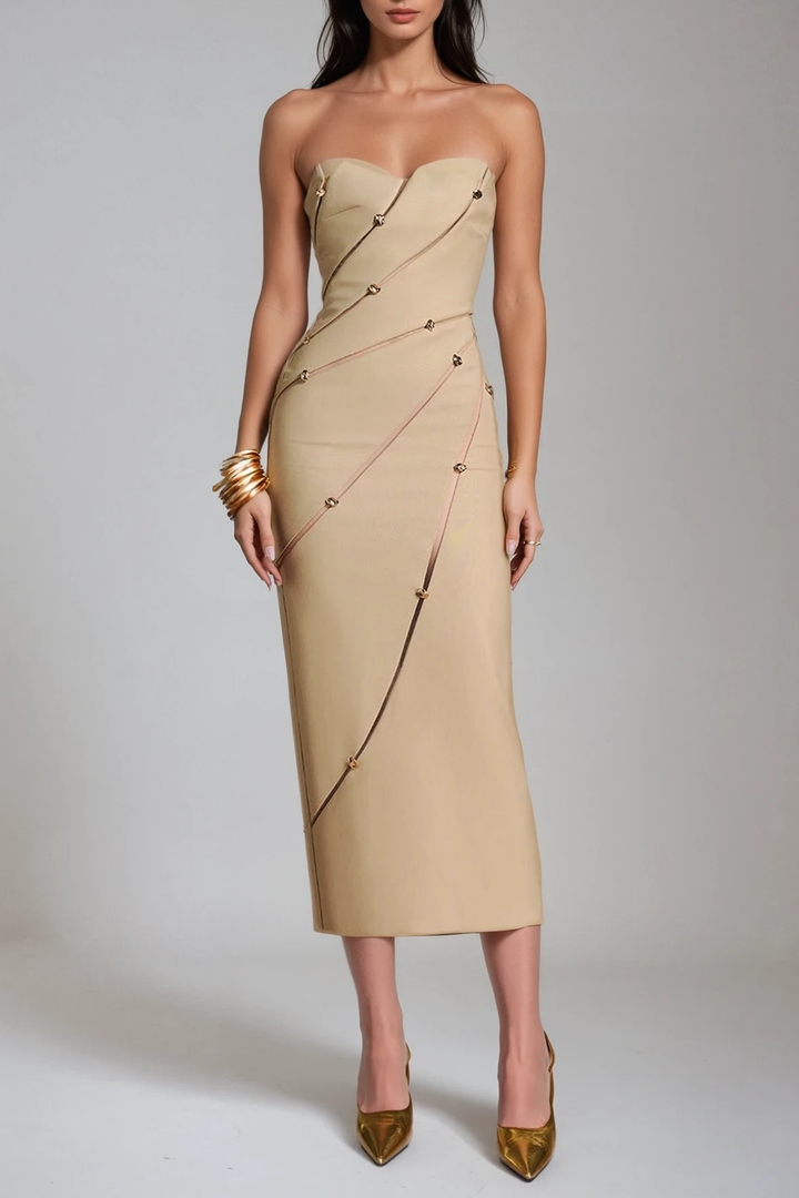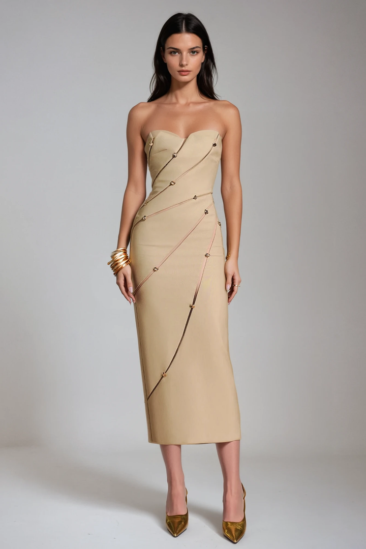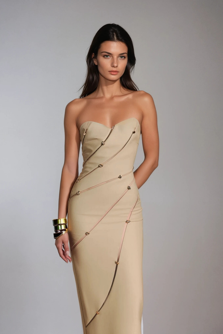 The Davinia Strapless Asymmetric Maxi Dress combines elegant design with modern sophistication. Featuring a strapless neckline and an asymmetric hem, it offers a striking silhouette that enhances natural grace. Crafted for a flattering fit, this maxi dress is ideal for formal occasions where style and comfort are paramount. Its flowing fabric and unique cut ensure movement with poise, making it a refined choice for your evening wardrobe.