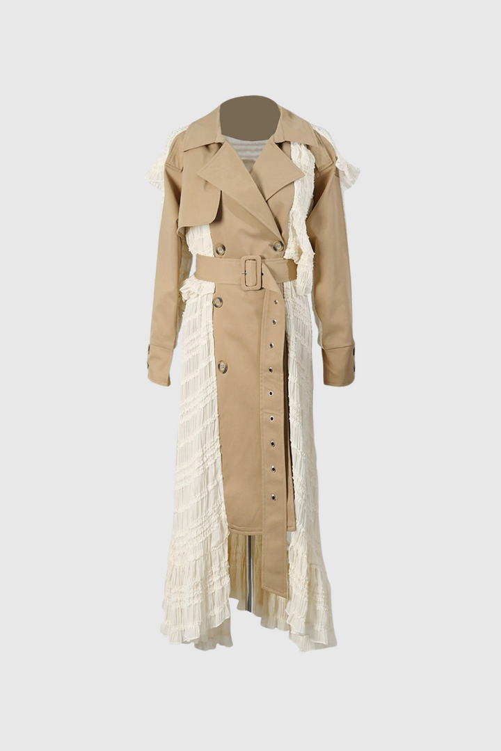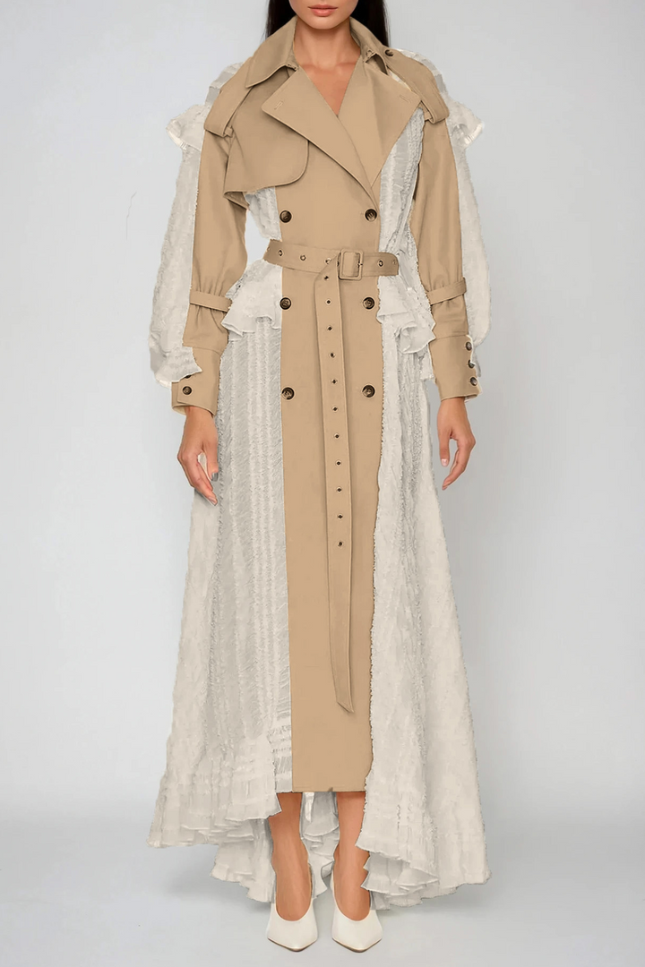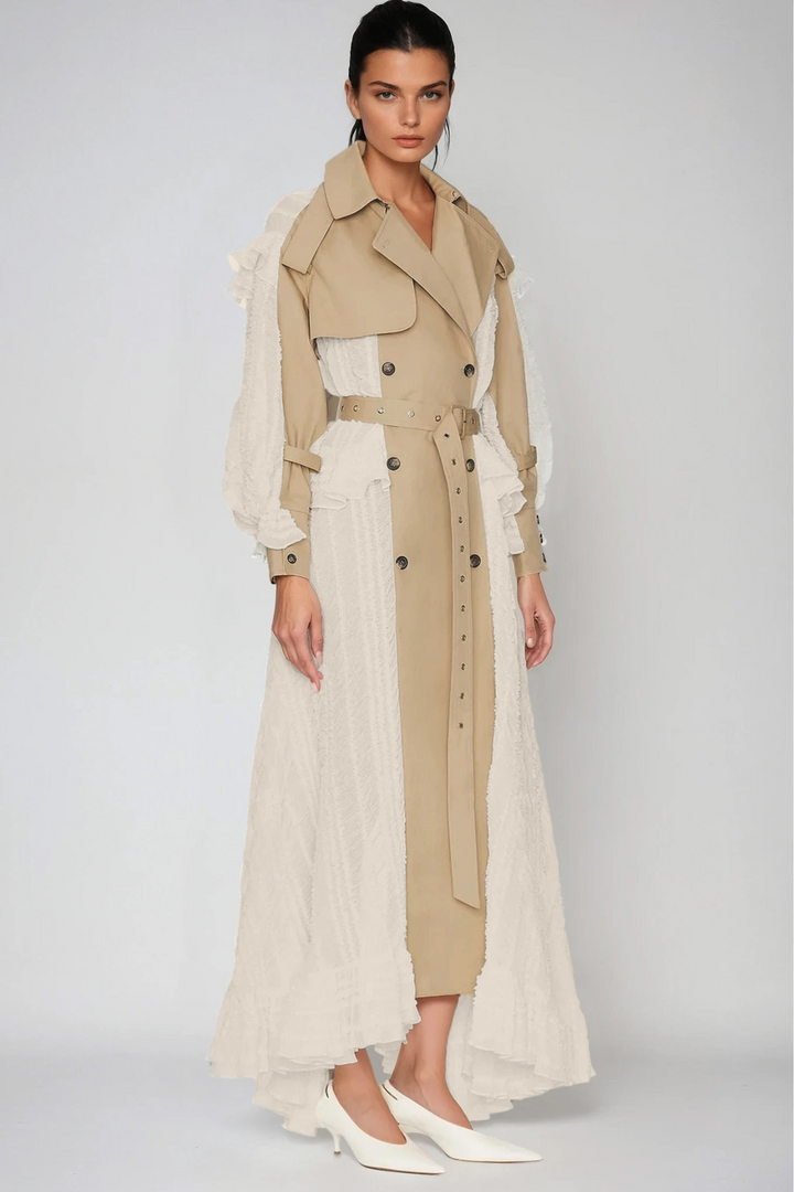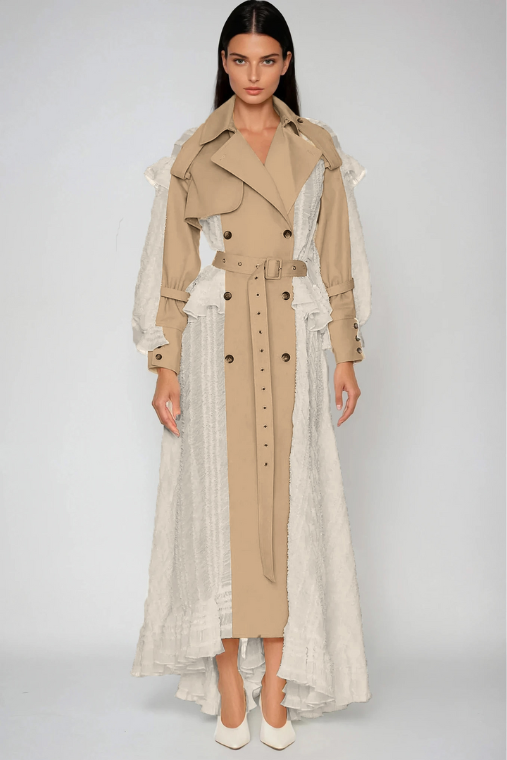The Davorin Deconstruct Ruffle Trench Coat redefines classic outerwear with an expert touch. Featuring carefully structured ruffles, this coat combines architectural design with timeless trench elements for a modern yet sophisticated look. Crafted to offer both style and movement, it provides versatile layering while elevating your wardrobe with intricate detailing and refined silhouette tailoring. Ideal for those seeking a statement piece that balances innovation and heritage in high-quality outerwear.