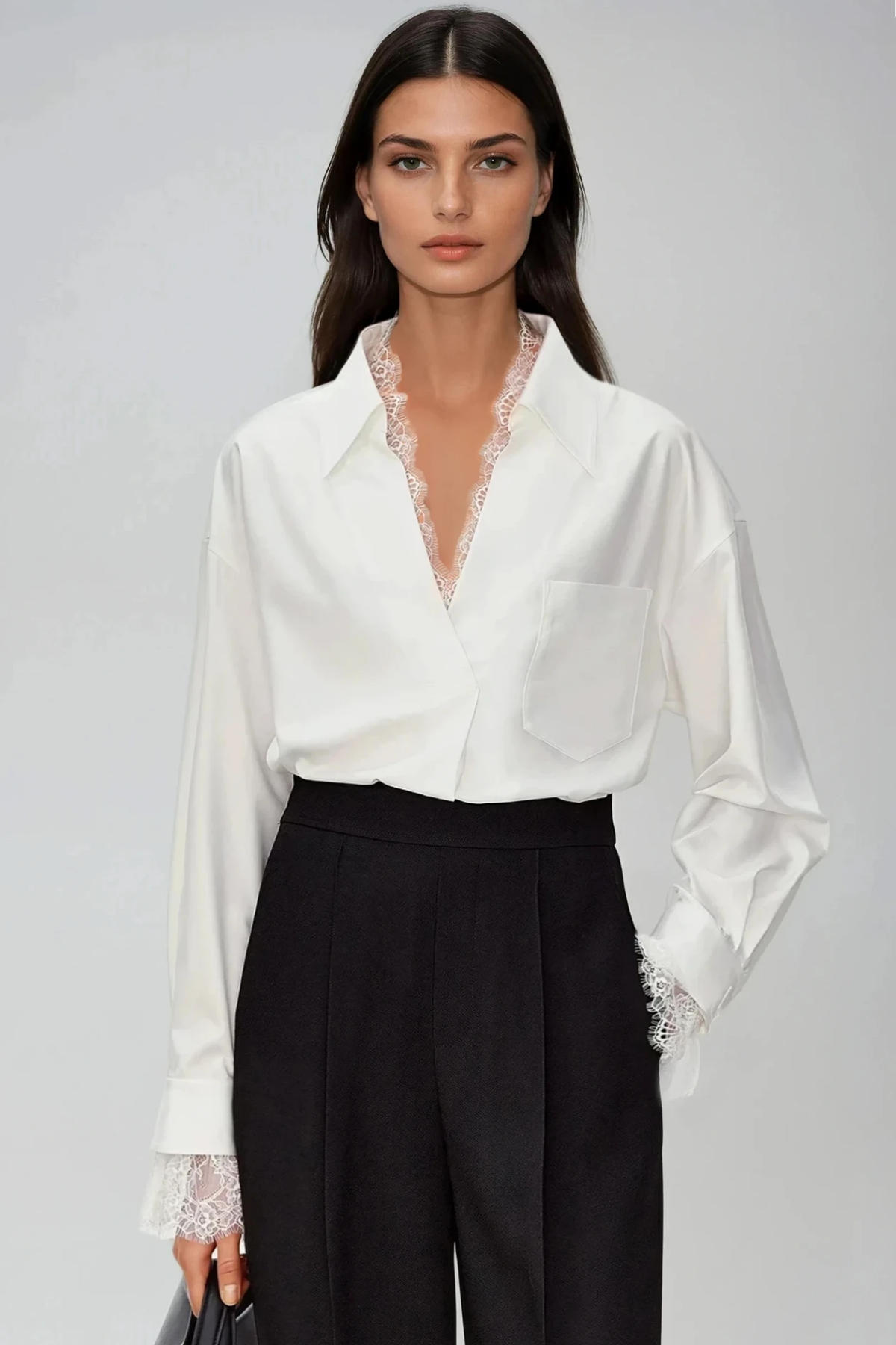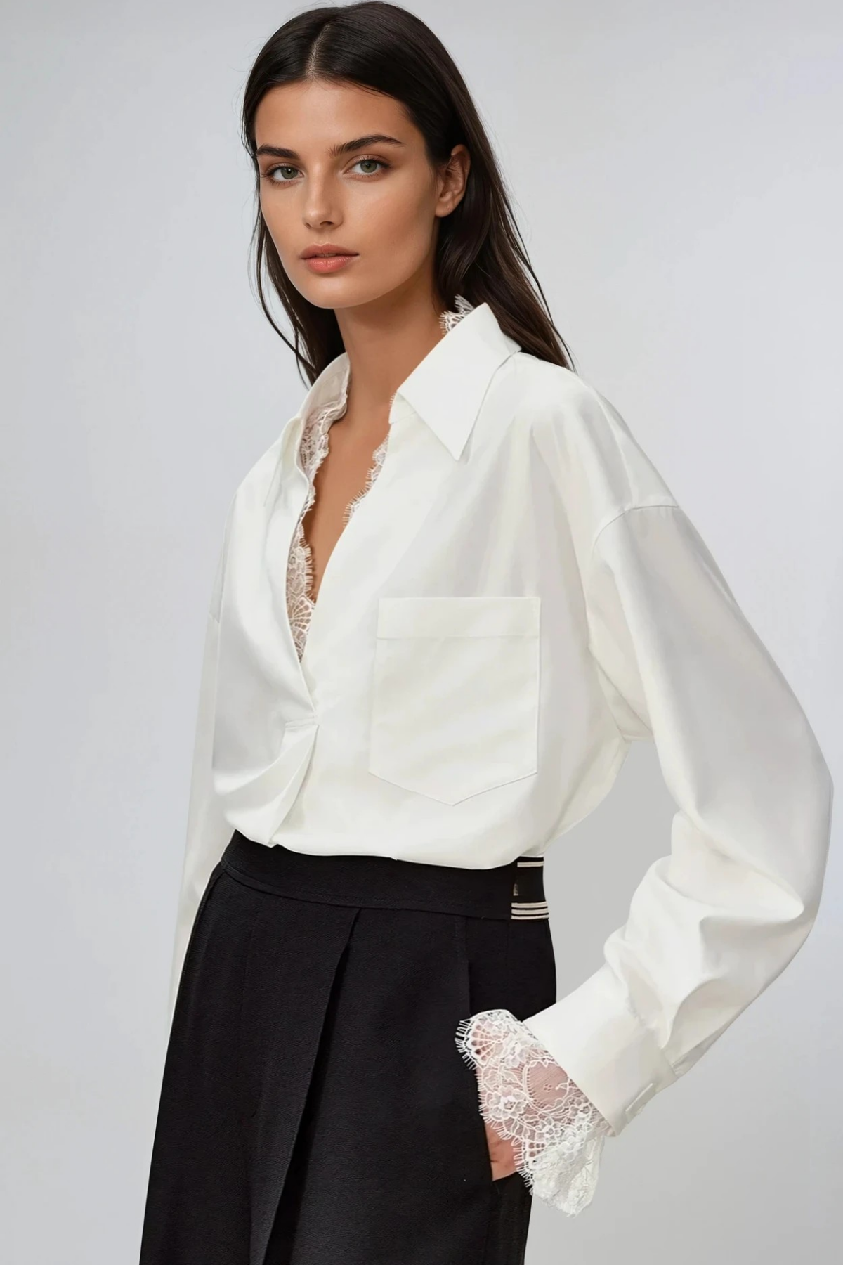 Elevate your wardrobe with this sophisticated Dip Lace V Neck Shirt, where refined tailoring meets delicate detailing. The plunging V neckline creates a flattering silhouette, while intricate lace paneling adds texture and visual interest. Crafted for versatility, this piece transitions seamlessly from casual daytime wear to evening occasions. The dip lace construction provides breathable comfort without compromising on style, making it an essential addition to any modern closet. Perfect for layering or wearing solo, this shirt delivers understated elegance with contemporary flair.