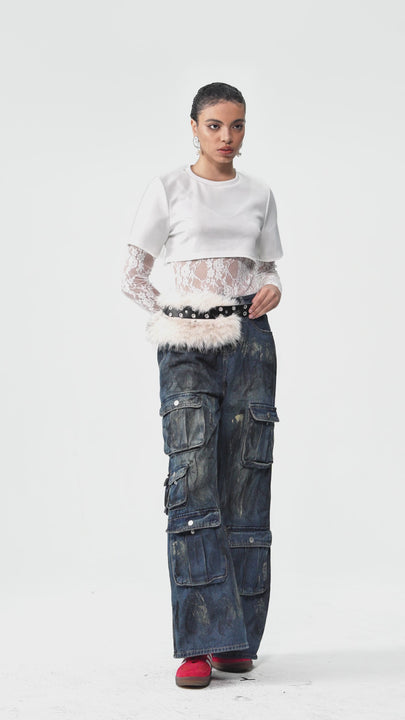 Elen Faux Fur Cargo Dark Wash Jeans combine utilitarian design with contemporary luxury. Crafted in a rich dark wash denim, these cargo jeans feature strategically placed faux fur accents that elevate the utilitarian silhouette with tactile sophistication. Multiple cargo pockets deliver practical storage without compromising the streamlined aesthetic. The faux fur detailing adds dimensional texture and visual interest, making these jeans a distinctive statement piece that transitions seamlessly from casual wear to elevated streetwear. Perfect for those seeking functional style with an unexpected edge.