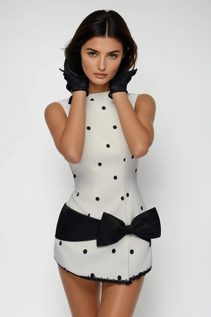 The Deja Sleeveless Dot Bow Mini Dress combines playful elegance with expert tailoring. Featuring a delicate dotted pattern and a flattering sleeveless cut, this mini dress is elevated by a sophisticated bow detail that adds a touch of refined charm. Its tailored silhouette ensures a comfortable yet polished fit, making it ideal for both casual outings and stylish events. Crafted for those who appreciate subtle statement pieces, the dress balances timeless femininity with modern sensibility.