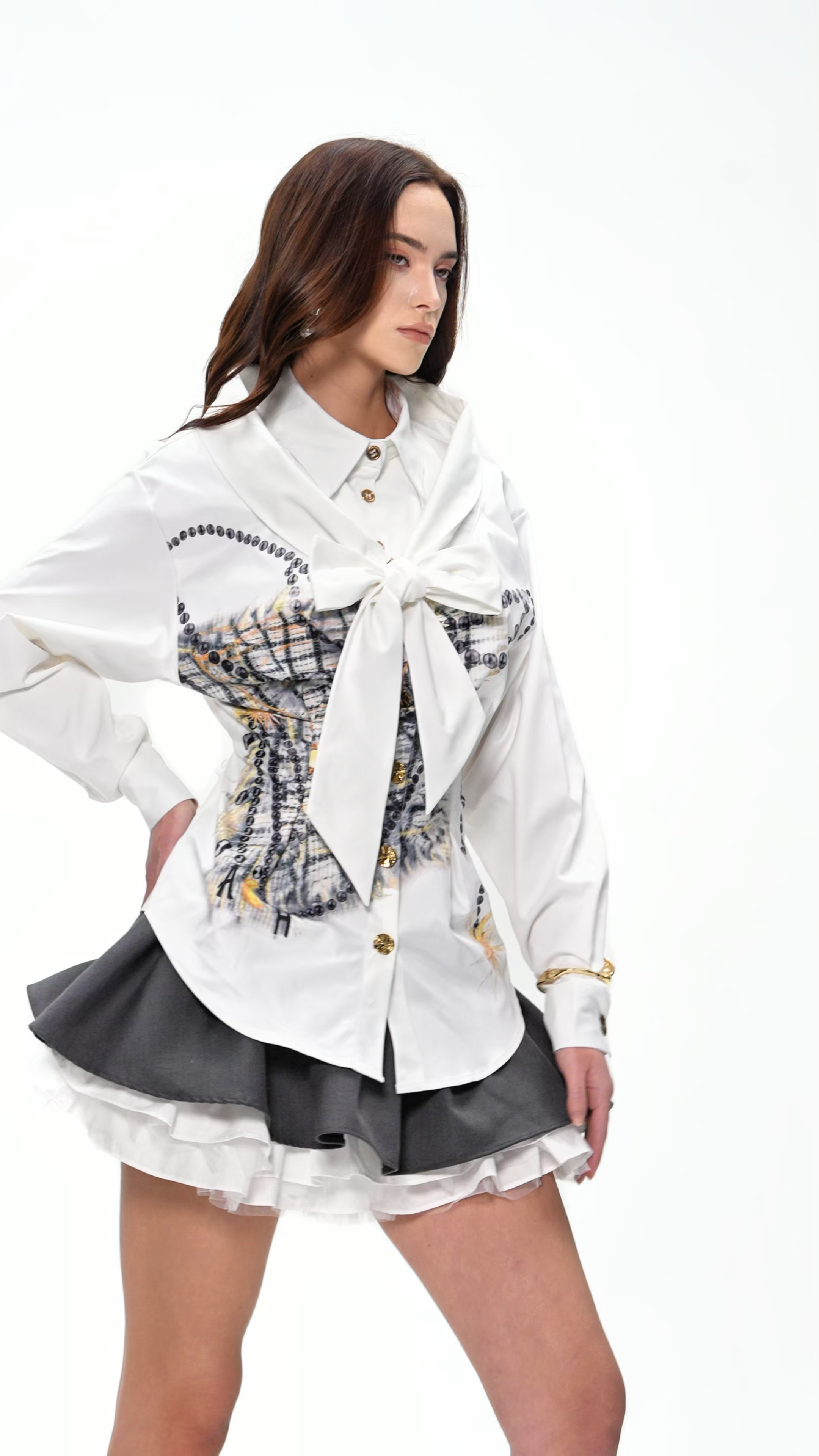 The Ercanbald Bow Asymmetric Print Shirt combines contemporary style with unique detailing. Featuring an elegant bow and a striking asymmetric print, this shirt offers a refined yet artistic look, perfect for modern wardrobes seeking statement sophistication.