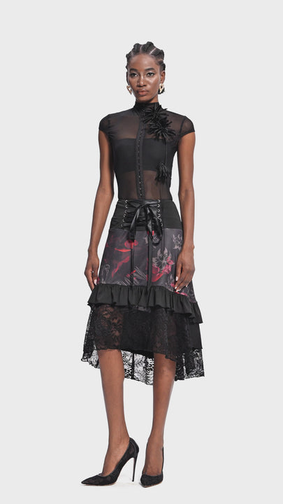 The Fabienne Lace Up Lace High Low Skirt combines delicate femininity with contemporary silhouette design. Crafted from intricate lace, this piece features a flattering high-low hemline that transitions from shorter front to longer back, creating dynamic movement and visual interest. The lace-up detailing adds an edgy, modern touch while maintaining an elegant aesthetic. Perfect for elevated casual occasions or dressed-up evening wear, this skirt works seamlessly with both fitted tops and oversized pieces. The asymmetrical cut ensures you'll stand out while the quality lace construction promises lasting wear and comfort.