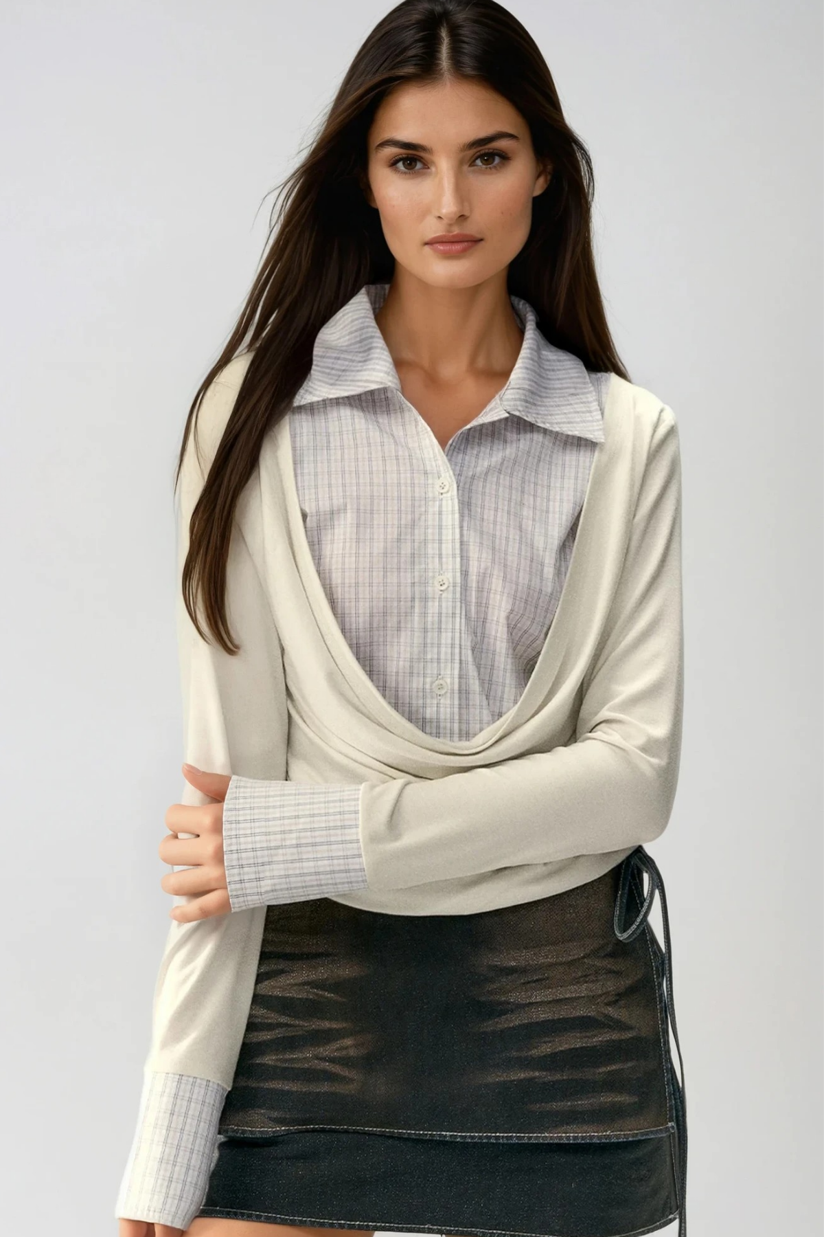 The Donelle Grid Cowl Neck Shirt combines refined tailoring with contemporary design. Featuring a distinctive grid pattern and elegant cowl neckline, this piece transitions seamlessly from office to evening wear. The draped neckline creates a flattering silhouette while the structured grid texture adds visual interest and dimension. Crafted for versatility, it pairs effortlessly with tailored trousers, skirts, or layered under blazers. An essential addition to any sophisticated wardrobe that values both style and wearability.