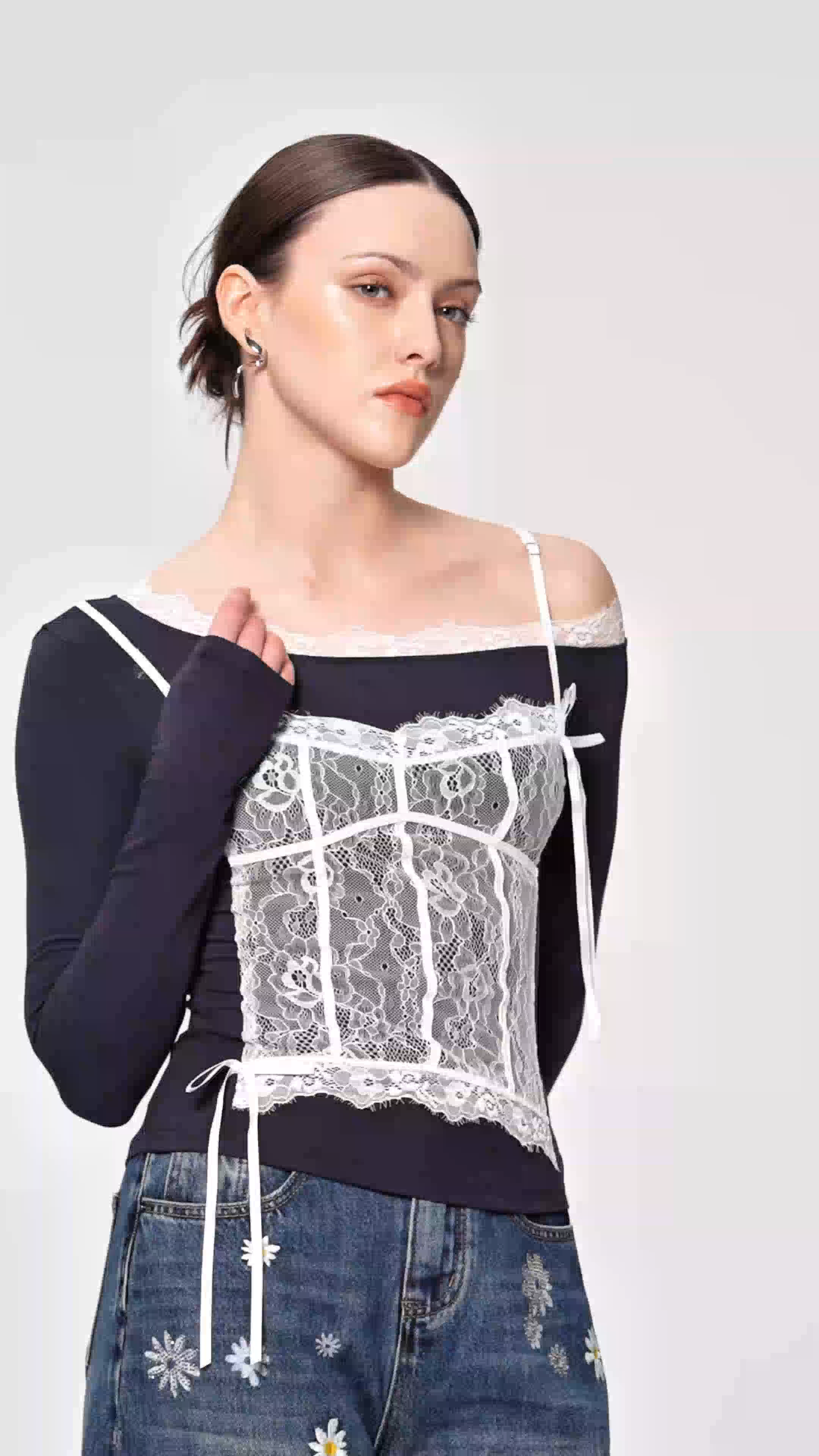 Elevate your evening wardrobe with this sophisticated one-shoulder lace top in classic black. The delicate lace fabrication creates an elegant, refined aesthetic while the asymmetrical neckline adds contemporary flair and visual interest. The single-shoulder silhouette flatters various body types and transitions seamlessly from cocktail events to upscale dinners. Crafted for those who appreciate timeless design with modern sensibility, this piece pairs effortlessly with tailored trousers, sleek skirts, or denim for versatile styling options. A wardrobe essential that combines understated luxury with wearable sophistication.