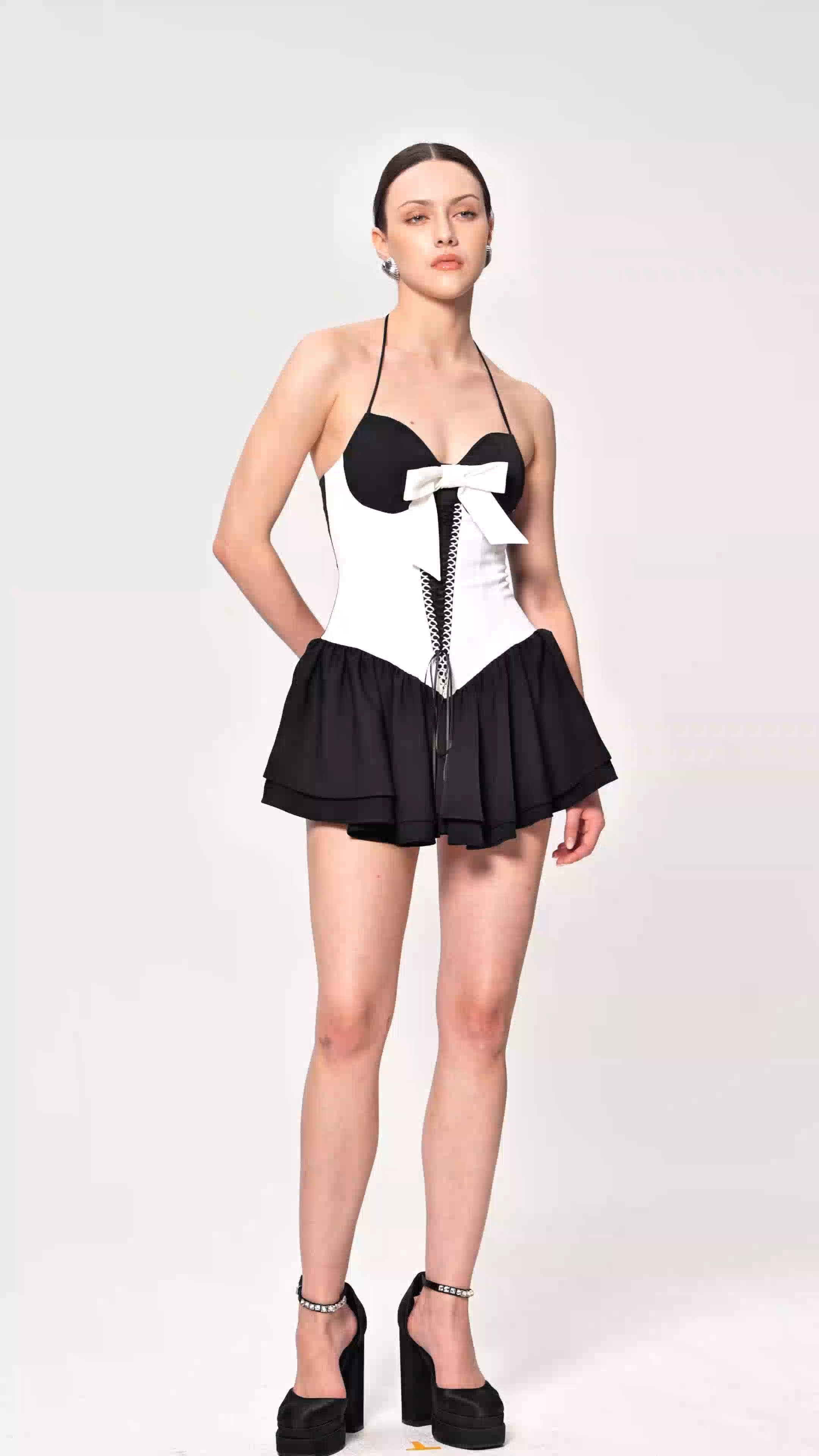 Eitan Lace Up Corset Ruffle Mini Dress This striking mini dress combines structured corsetry with romantic ruffled detailing for a bold, fashion-forward silhouette. The lace-up corset bodice provides a sculpted fit and adjustable support, while cascading ruffles add movement and dimension to the skirt. Perfect for making an entrance at evening events, parties, or when you want to command attention. The contrast between the fitted corset and voluminous ruffles creates a dynamic look that balances elegance with edge. An investment piece for those who embrace statement dressing.