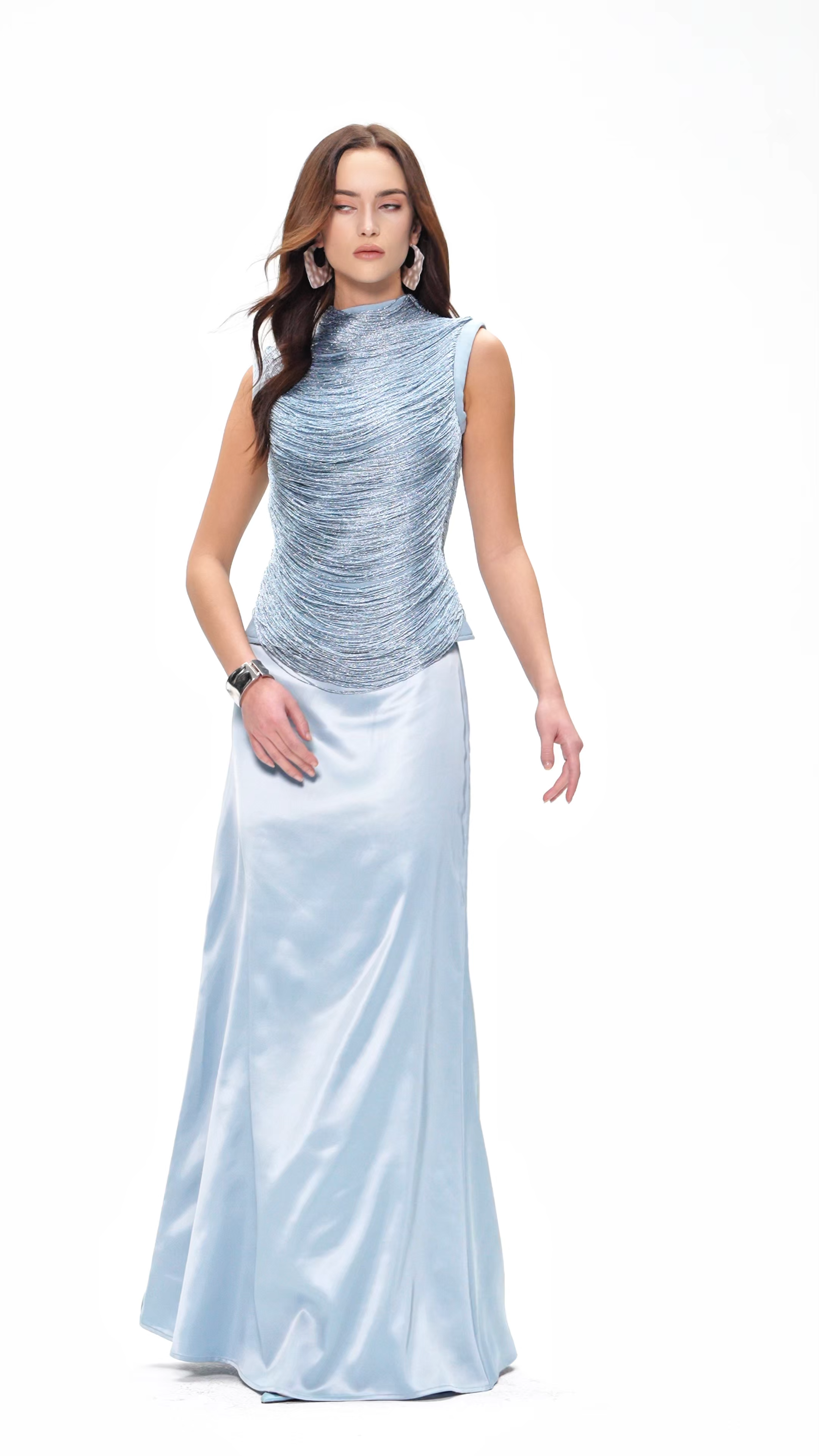 Fedde Fringe Satin Skirt Set In Sky Blue