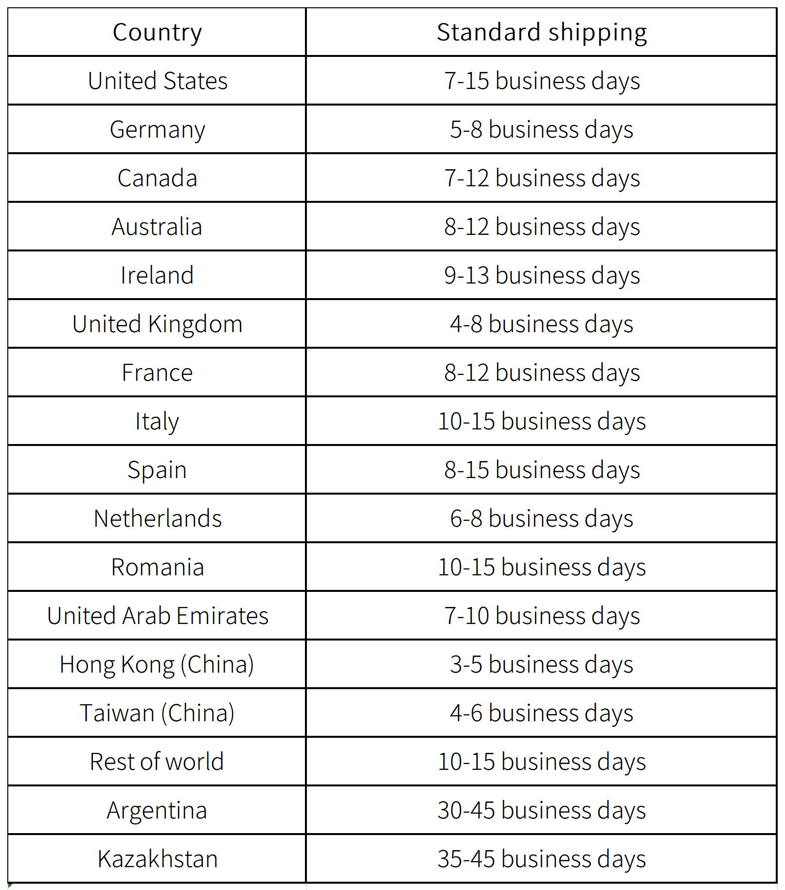 We ship worldwide! All our shipping prices are in US Dollars (USD). Please note that business days DO NOT include weekends or public holidays. See below to find more information regarding delivery timeframes per destination:
