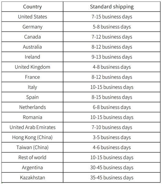 We ship worldwide! All our shipping prices are in US Dollars (USD). Please note that business days DO NOT include weekends or public holidays. See below to find more information regarding delivery timeframes per destination: