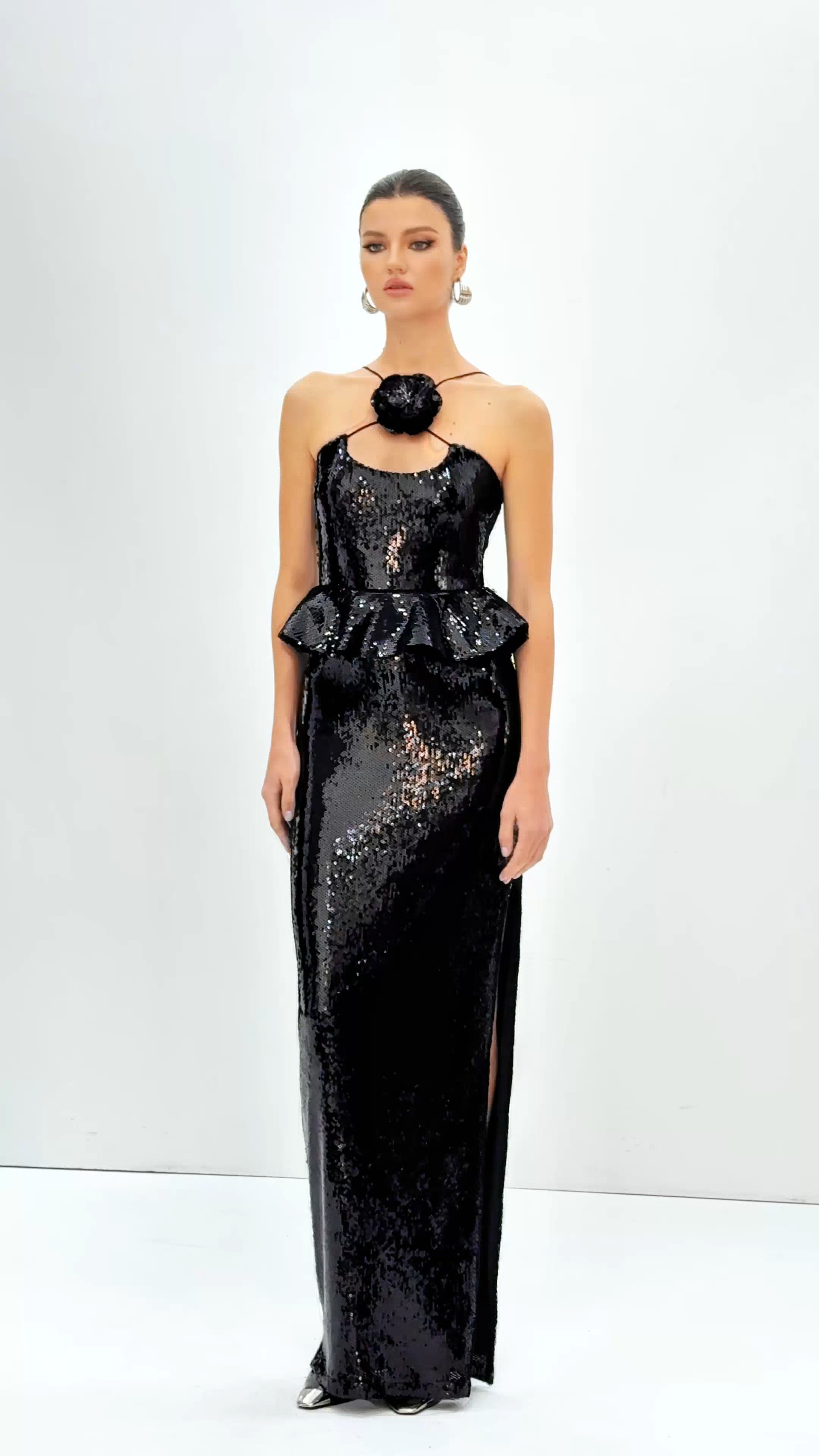 This Ambar Sequin Flower Ruffle Maxi Dress is a stunning piece that will elevate any wardrobe. The intricate sequin flower design adds a touch of glamour, while the ruffle detail adds a feminine touch. Made with high-quality materials, this dress is not only stylish but also comfortable to wear. Perfect for any special occasion.