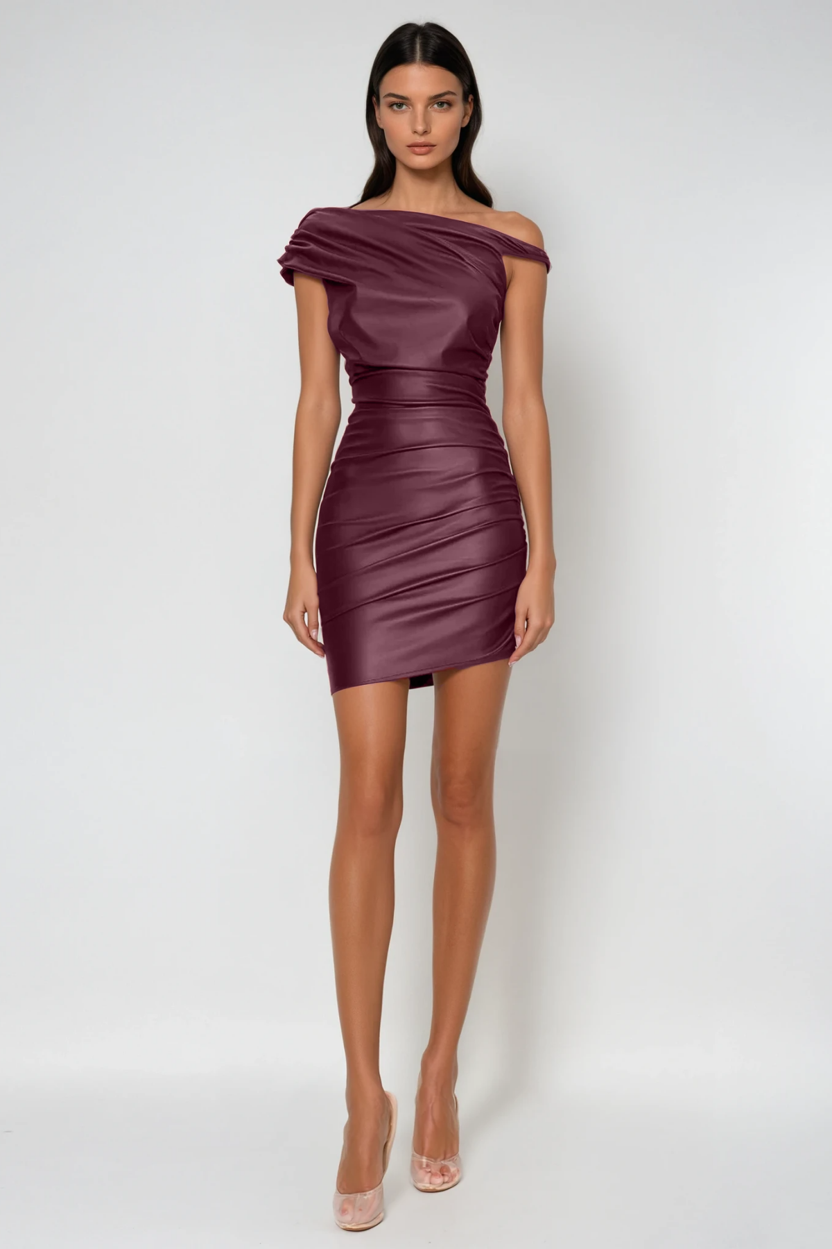 Expertly crafted from genuine leather, the Aquaria Ruch Twist Asymmetric Mini Dress in Red is a must-have for any fashion-forward individual. The unique ruched twist detailing creates a flattering silhouette, while the asymmetrical hem adds a touch of modern edge. Elevate your style game with this statement piece.