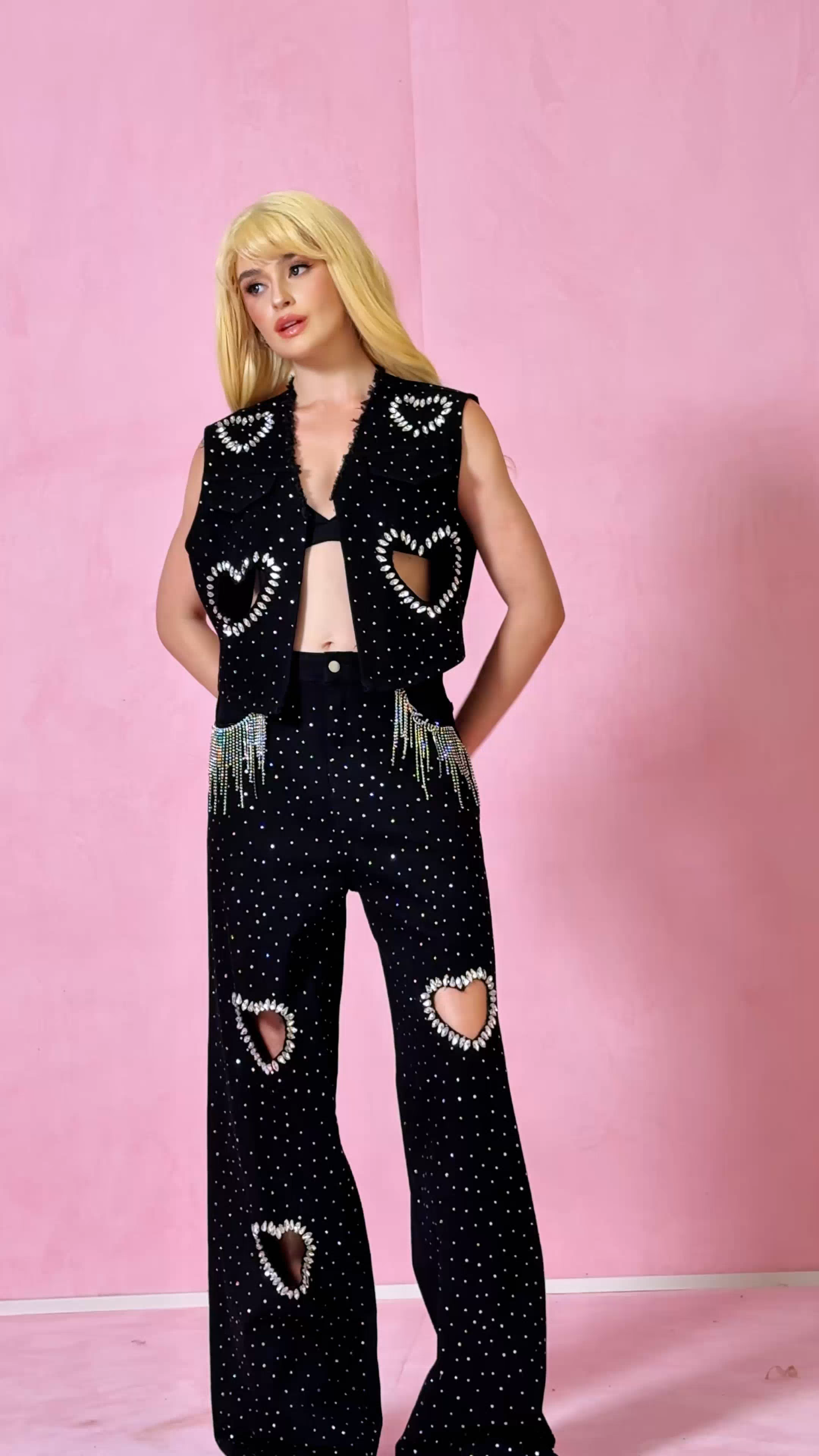 Discover the perfect blend of style and comfort with the Beat Rhinestone Cutout Love Denim Pants Set. Made with high-quality denim fabric, this set features stunning rhinestone detailing and a unique cutout design, adding a touch of glamour to any outfit. Elevate your wardrobe with this must-have set.