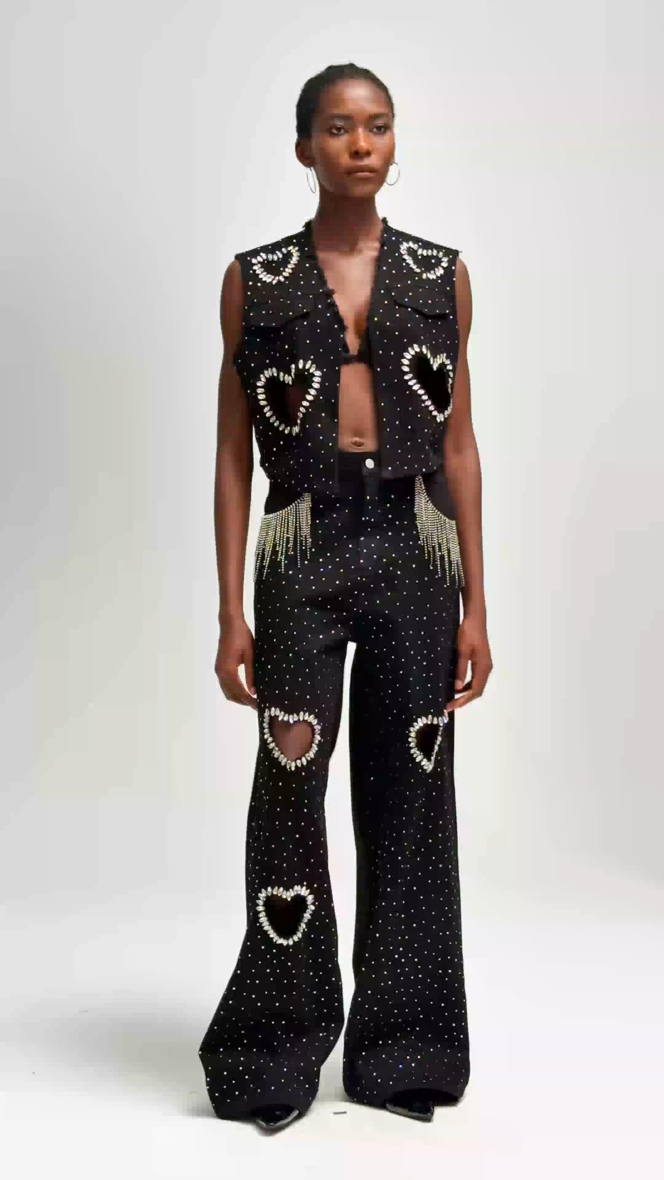 Discover the perfect blend of style and comfort with the Beat Rhinestone Cutout Love Denim Pants Set. Made with high-quality denim fabric, this set features stunning rhinestone detailing and a unique cutout design, adding a touch of glamour to any outfit. Elevate your wardrobe with this must-have set.