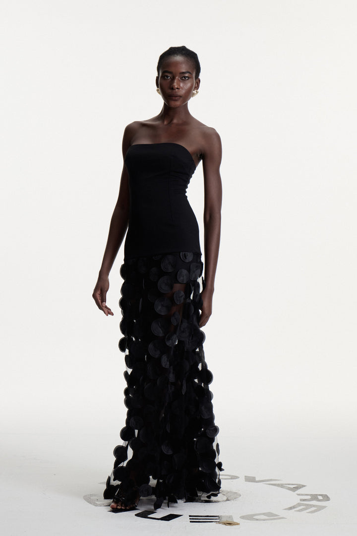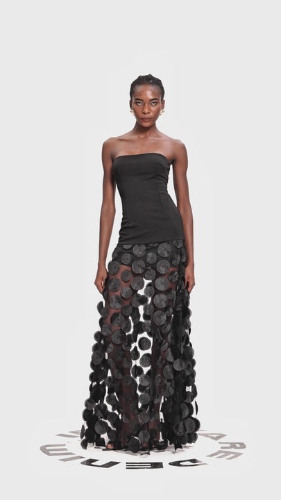 The Boryana Dot Strapless Maxi Dress in Black combines timeless elegance with modern sophistication. Crafted with a delicate dot pattern, this strapless maxi dress offers a flattering silhouette that enhances your natural shape. Its flowing fabric ensures comfort and graceful movement, making it ideal for formal events or evening occasions. The classic black hue adds versatility, allowing effortless pairing with various accessories for a polished, expert look.