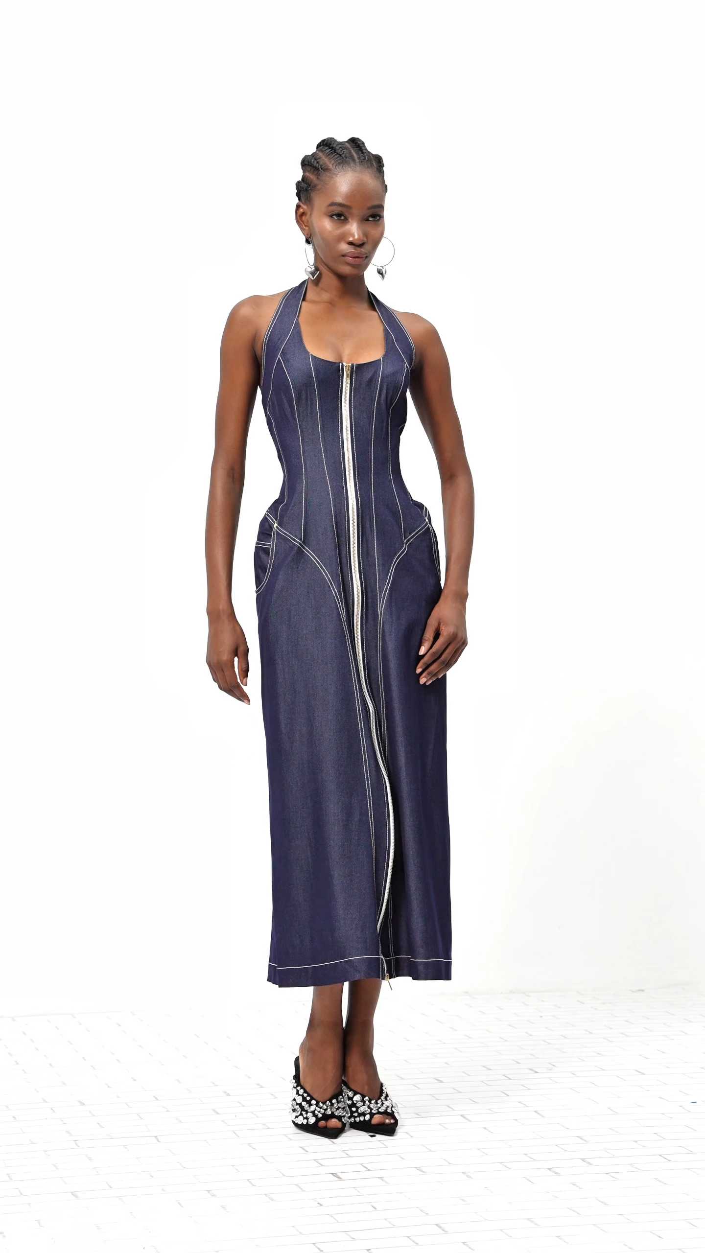 The Cirillo Halter Neck Corset Denim Maxi Dress expertly combines structure and fluidity for a striking silhouette. Crafted from quality denim, it features a fitted corset-style bodice that enhances the waist, while the halter neck adds a sophisticated touch. The flowing maxi skirt offers both elegance and comfort, making it ideal for day-to-night wear. This dress balances contemporary design with timeless denim durability, perfect for those seeking a refined yet casual statement piece.