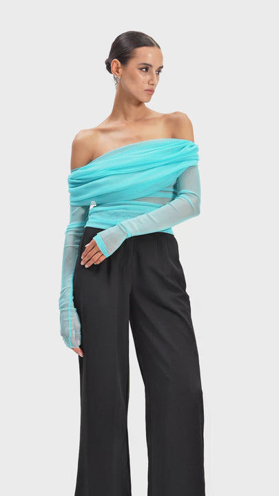 Clement Off Shoulder Ruch Mesh Top In Blue
